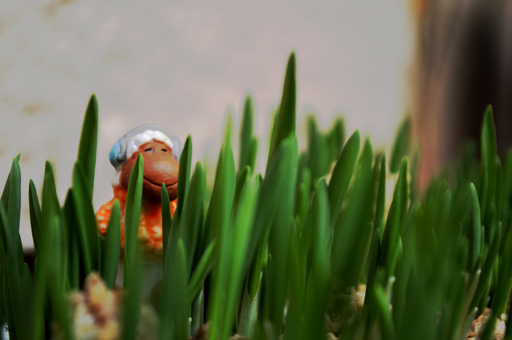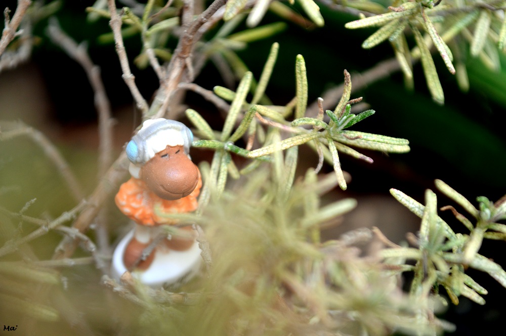 Après avoir vu des photos sur Instagram, où l’auteur s’amuse à mettre en scène de petits personnages, j’ai eu envie d’essayer aussi. J’ai trouvé une fève en forme de petit personnage… et j’ai avisé le plat d’herbe à chat en train de pousser (Vador aime bien grignoter de la verdure aux beaux jours…) ainsi que le petit buisson de romarin couvrant.