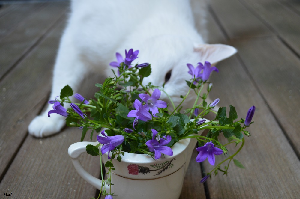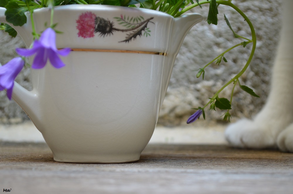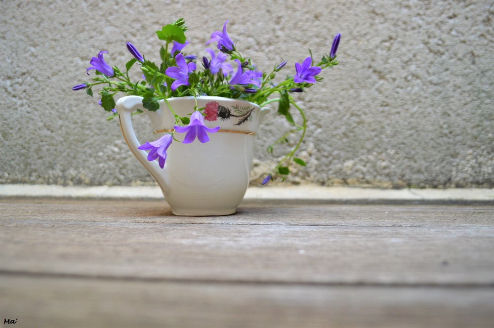 De l’autre côté de ma rue, il y a une maison inoccupée dont les bordures sont envahies par les campanules… Alors, j’ai récupéré de quoi faire un petit bouquet champêtre… et quelques photos !