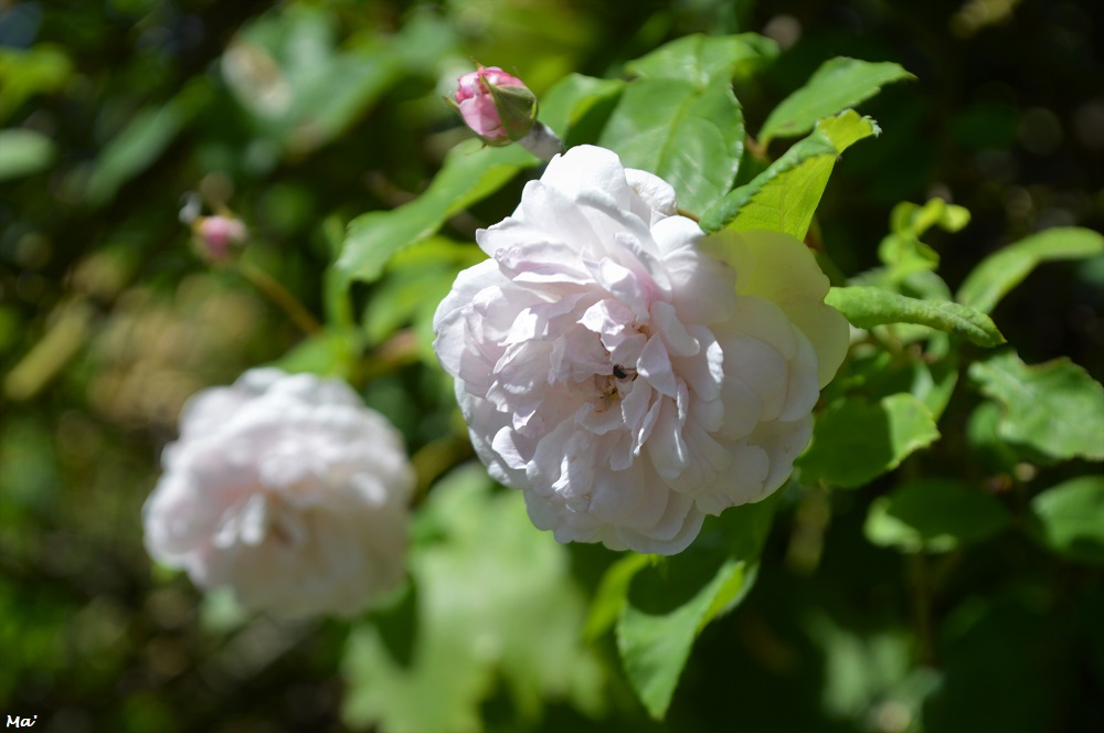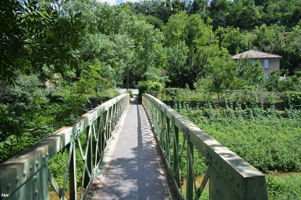 Un après-midi, après une course, je suis donc partie (panier encore à la main) faire un tour au bord de la rivière. Après m’être arrêtée pour admirer les roses qui dépassent des haies et des jardins, j’ai traversé la passerelle.