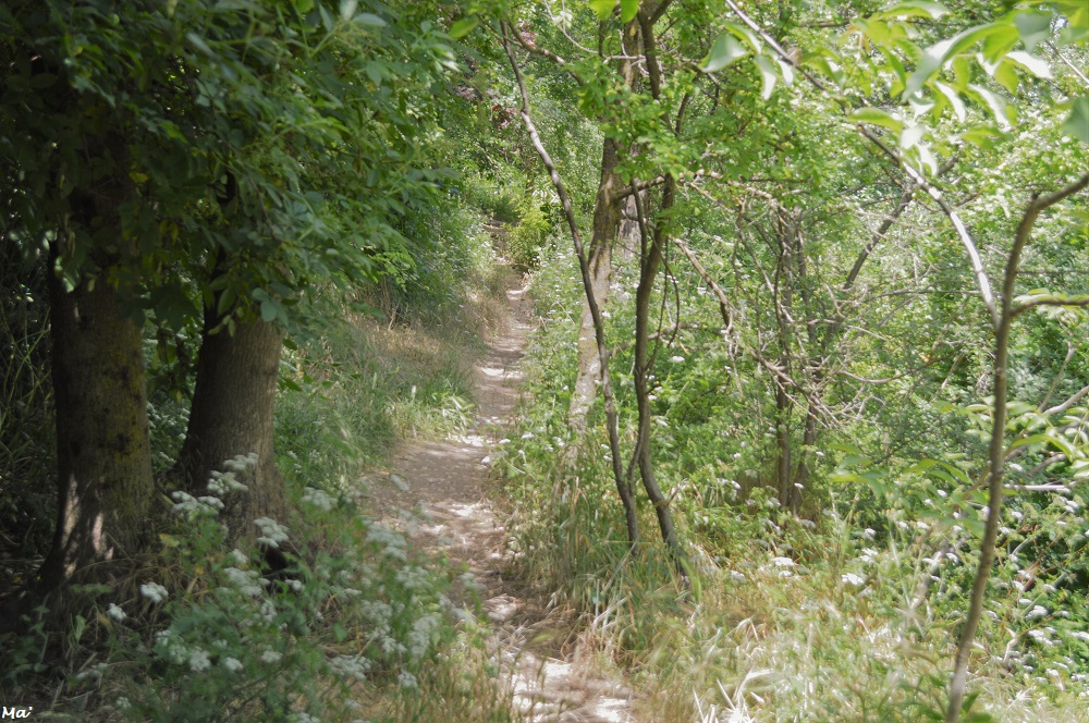 Les herbes sont hautes autour du chemin. La végétation a aussi envahi le lit de la rivière. Mais sous le couvert des arbres, un petit vent apporte agréablement un peu de fraîcheur.