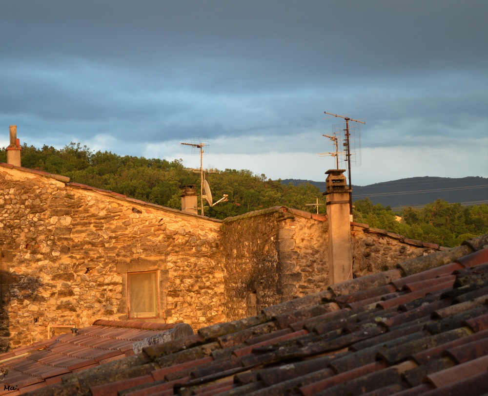 JEUDI 4 JUIN. Les orages se succèdent et au moment du coucher du soleil, alors qu’une nouvelle averse se prépare, le ciel prend une teinte orangée à l’est qui se reflète dans les vieilles pierres des maisons et contraste avec le sombre de nuages en approche.