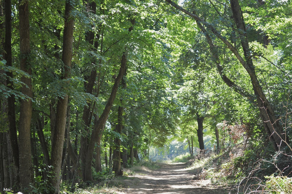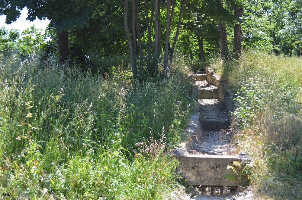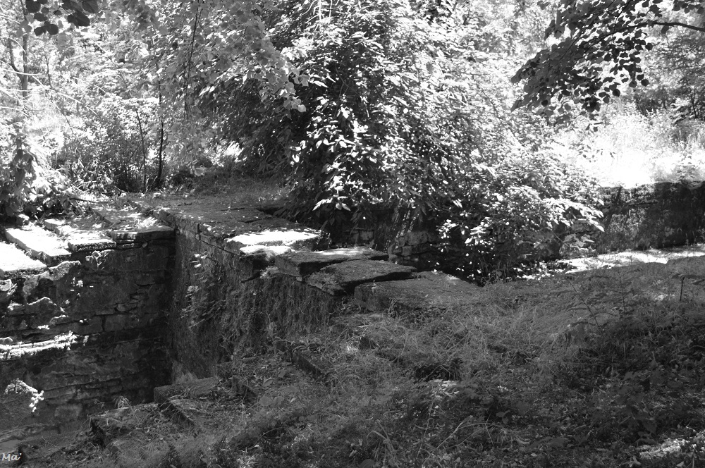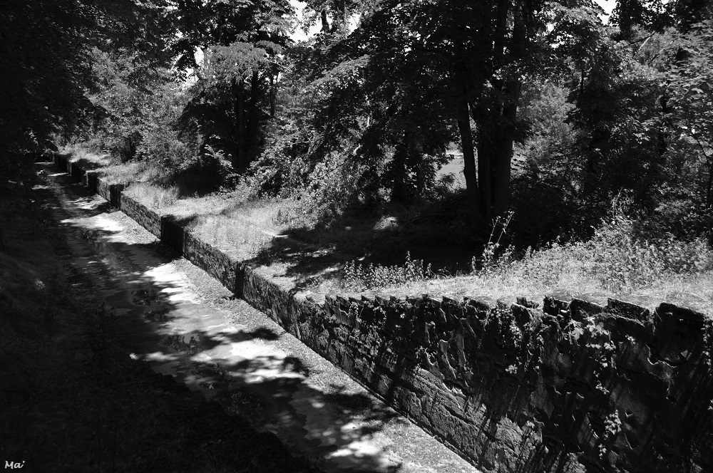C’est à cet endroit que nous repérons les premières traces du système hydraulique : une canalisation ouverte descend du coteau. Nous la longeons en remontant la colline sous le couvert des arbres. La canalisation serpente puis se perd dans la végétation (peut-être devient-elle souterraine ? peut-être a-t-elle complètement disparu ? je n’ai pas vérifié).