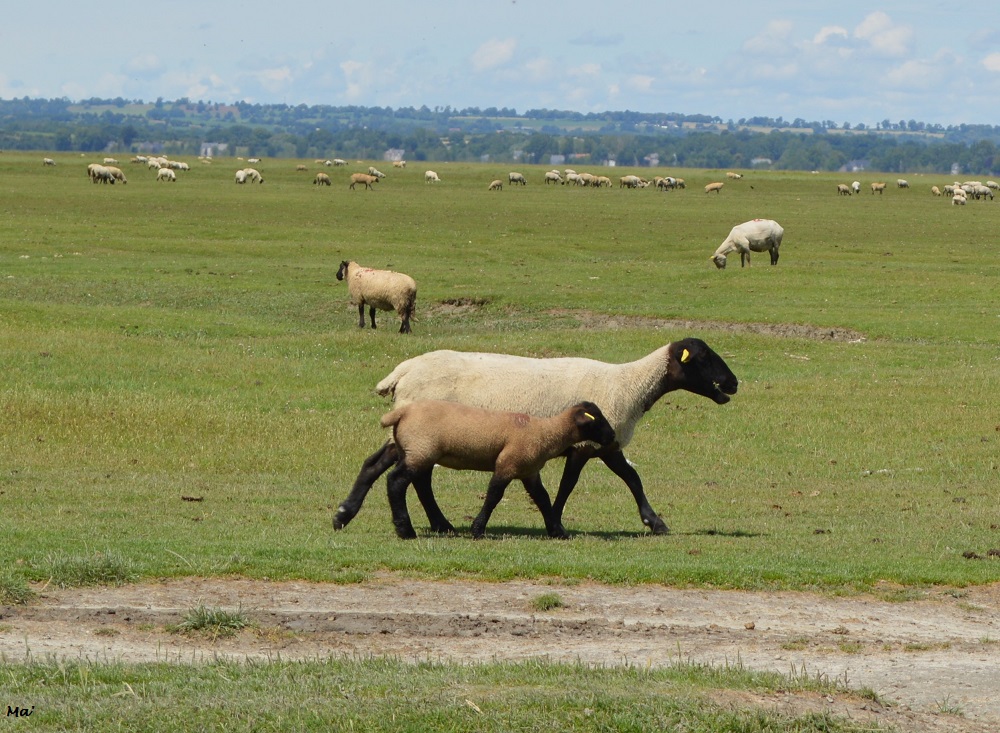 (*) Je suis allée au lieu-dit Le Rivage sur la commune d’Huisnes. Les moutons y sont très souvent. Pour vous y rendre, il faut emprunter la D275 en direction d’Avranches depuis le Mont Saint Michel. L’endroit est facile à repérer car il y a un parking assez grand et une aire de pique-nique en bordure de l’herbu (côté gauche de la route en direction d’Avranches). A une extrémité du parking, un grand portail permet d’accéder soit à un autre grand portail donnant sur la digue (balisage rouge et blanc du GR) soit à un portail plus petit donnant sur l’herbu. Compte-tenu de la présence des troupeaux, il est impératif de bien refermer les portails après les avoir franchis.