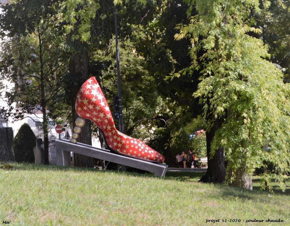 Toutefois, lors de ma visite au musée de la Chaussure à Romans, j’ai pris en photo la chaussure monumentale qui se trouve devant, un escarpin rouge à étoiles dorées d’Andréa Pfister (1994)… et le rouge est bien une couleur chaude !