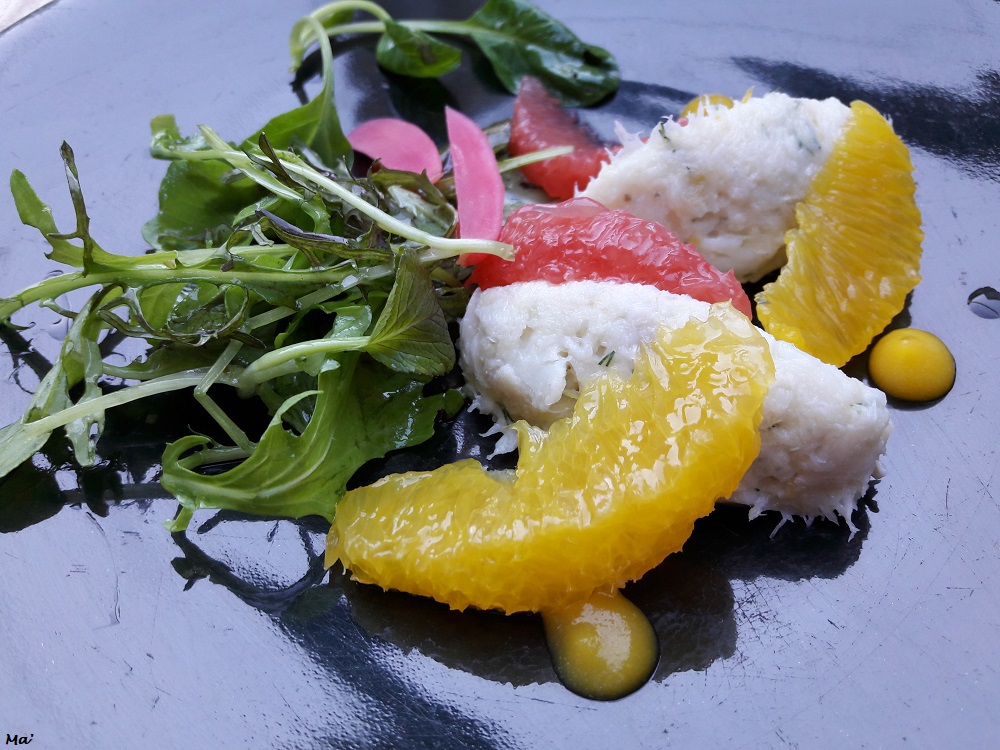 En entrée, nous n’avons pas retenu la soupe froide de tomates Green Zebra car nous avions mangé un peu trop de tomates les deux jours précédents (suite à une erreur de compréhension d’un message que j’avais fait pour demander à aller faire des courses un soir où mon train était en retard..). Nous avons donc choisi l’effeuillée de cabillaud confit à l’huile d’olive, servi avec une vinaigrette aux agrumes pomelo et aneth. J’ai beaucoup aimé le côté agrumes avec une amertume toute en délicatesse, qui vient subtilement souligner le goût du cabillaud.