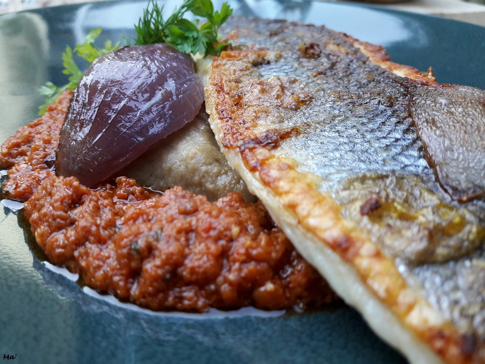 Pour le plat, nous avons tous les deux choisi le poisson (la viande était une épaule d’agneau braisée à la sarriette). La pêche du jour était un filet de bar servi avec un caviar d’aubergine fumée, oignon rouge et pesto rosso. Outre la présentation très appétissante, nous avons apprécié la cuisson très maîtrisée du poisson et l’accord entre le caviar d’aubergine et le pesto rosso. Mais ce qui m’a fait complètement tomber sous le charme, c’est l’oignon rouge confit (qui m’a d’ailleurs fait penser à une échalote…).
