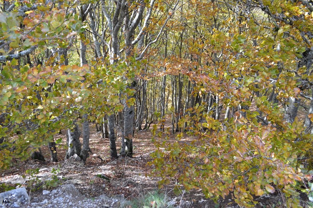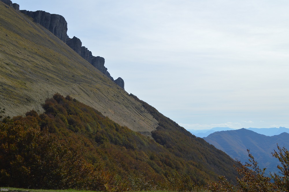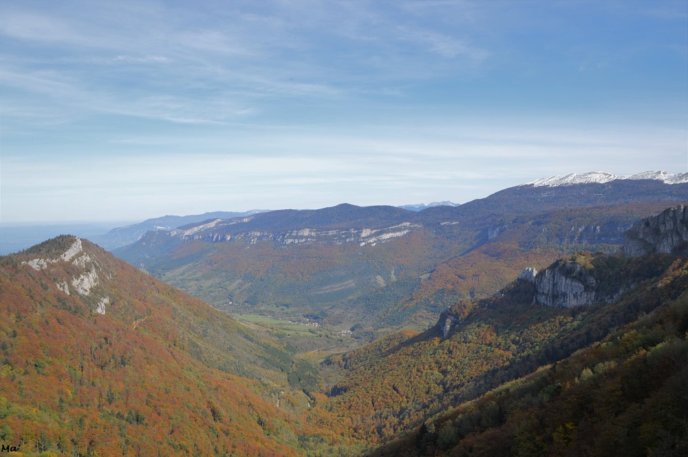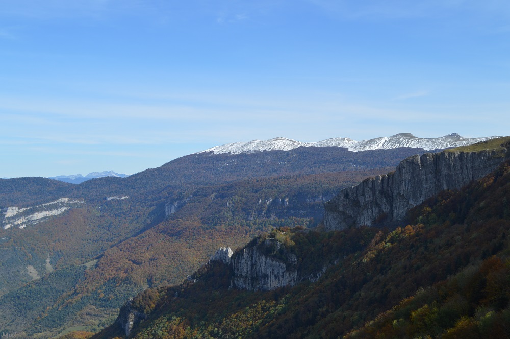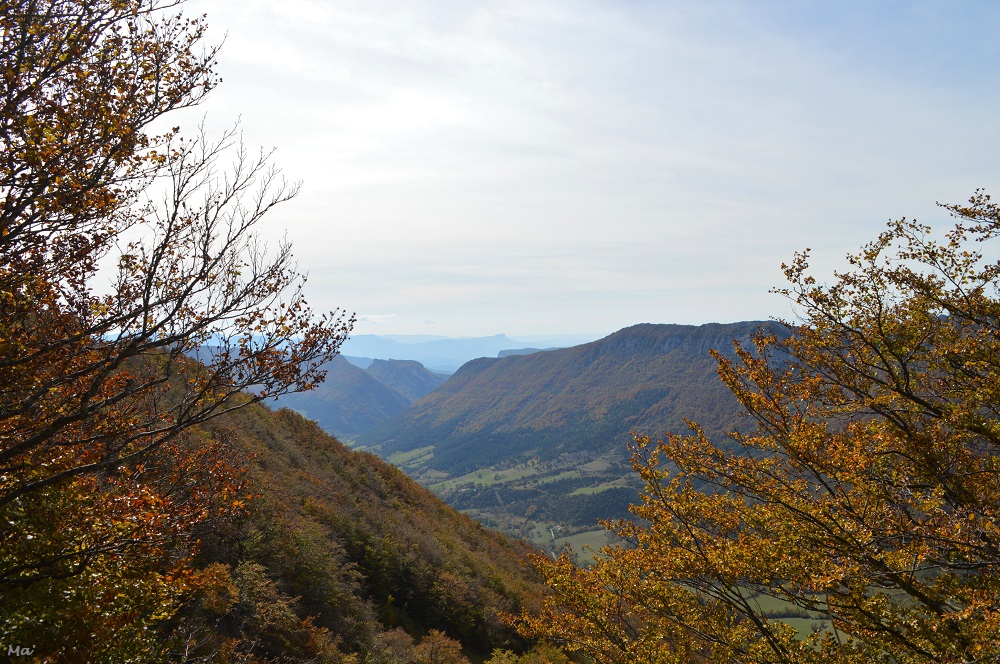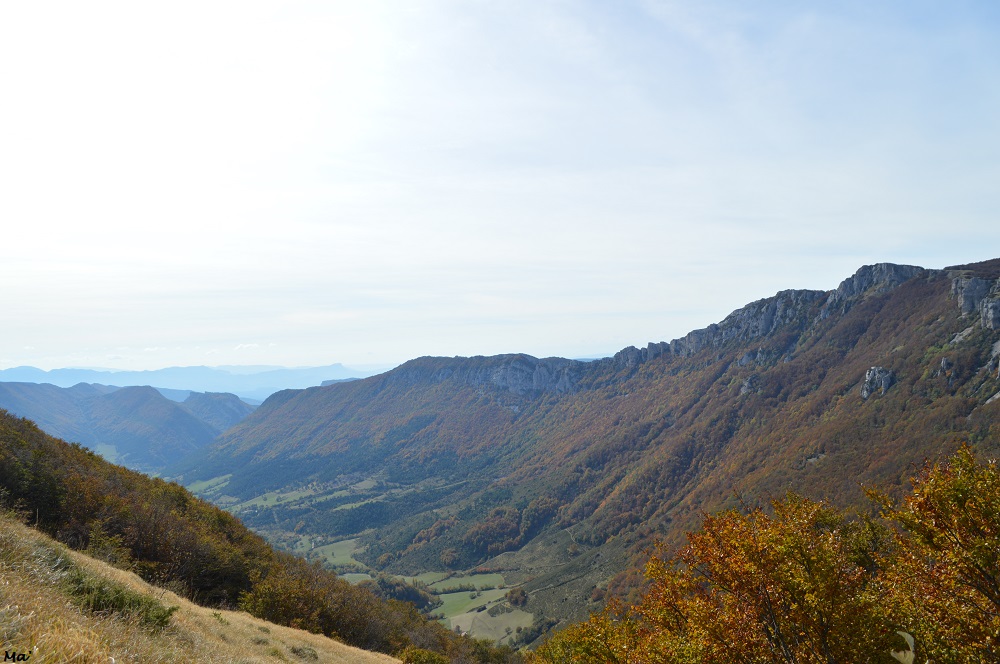 A nos pieds, la hêtraie se déployait en des couleurs chatoyantes. De l’autre côté de la vallée d’Omblèze, les rochers de la Sausse dominaient le paysage automnal.