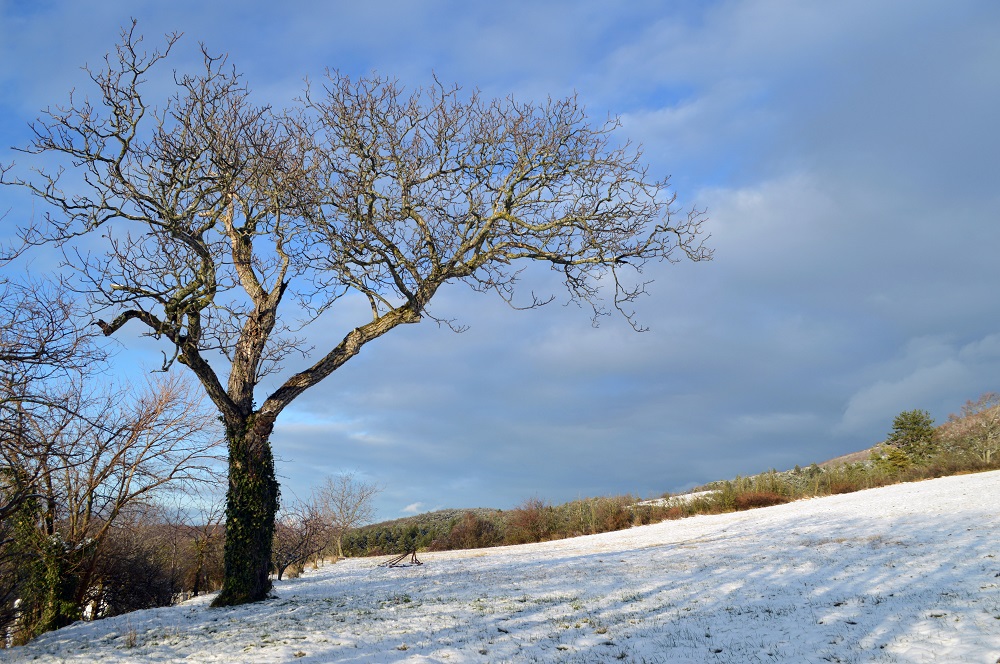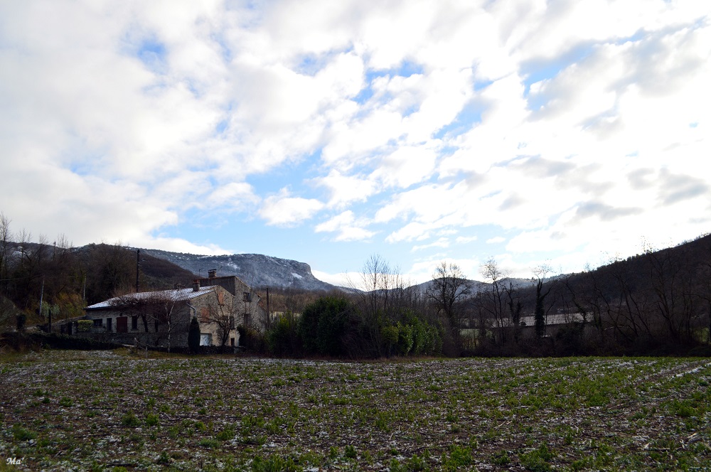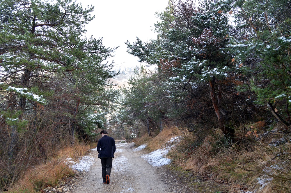 Pour cela, nous sommes allés à Peyrus, là où je m’étais déjà promenée lors des toutes premières neiges. Cette fois, les champs aux abords immédiats de la sortie du village sont blanchis. Nous n’aurons aucun mal à trouver la neige !