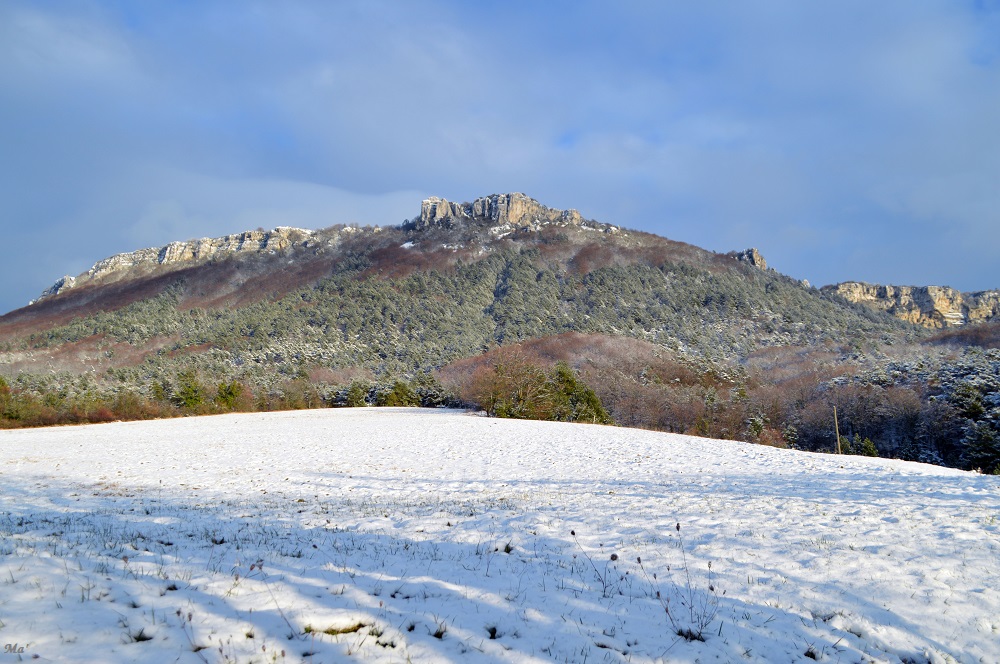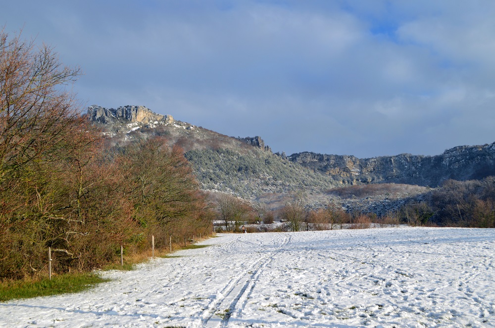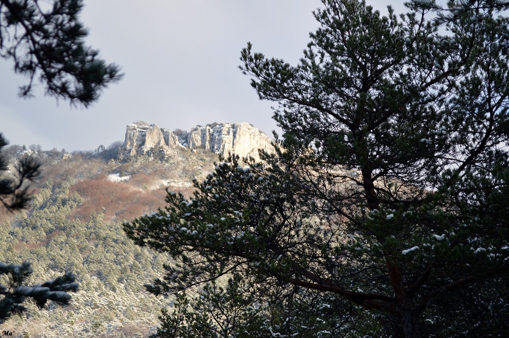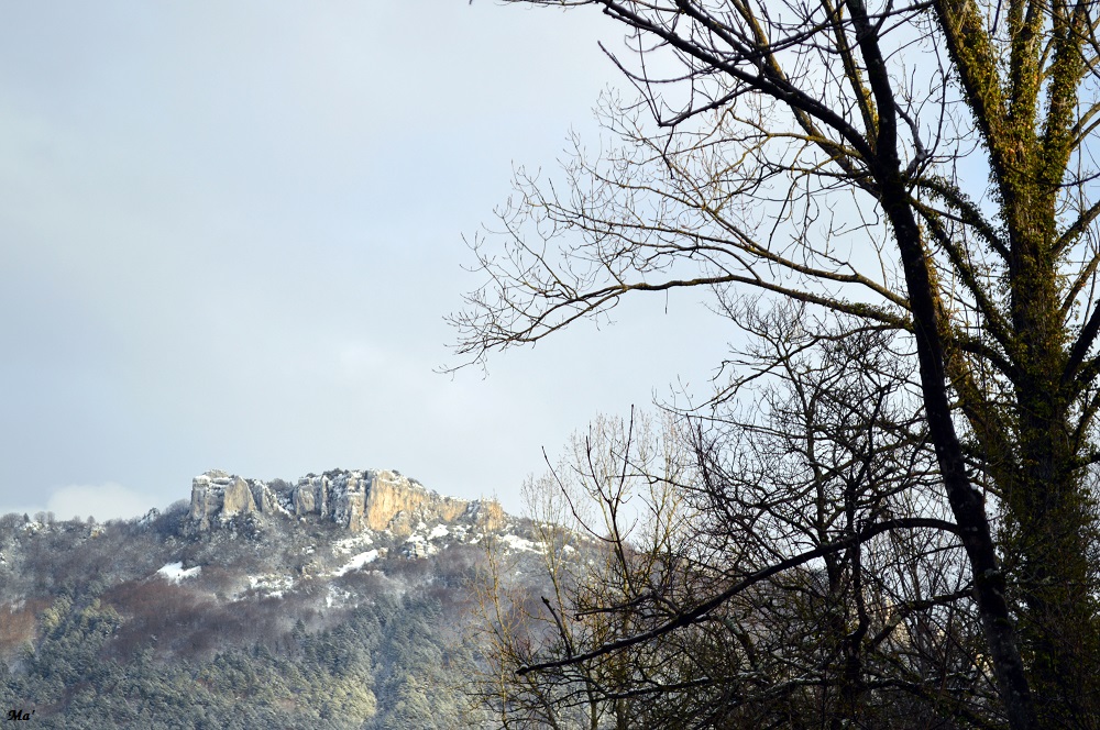 Les falaises des Rancs du Touet et des Roches de Treillaras dominent majestueusement le paysage. La température, plutôt douce (environ 3°C), fait fondre doucement la neige et l’on entend le plic-ploc des gouttes sur les feuilles. Le soleil brille et la balade est vraiment agréable.