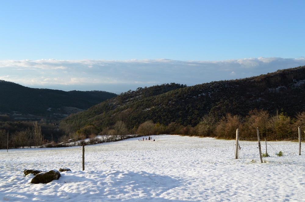 Nous avons laissé la voiture juste à la sortie de Peyrus et sommes partis sur la route en direction des Chichats. Plus nous montons, plus la neige est présente. Nous croisons plusieurs groupes de personnes avec des luges qui rentrent ou partent en direction des champs pentus situés dans les environs.