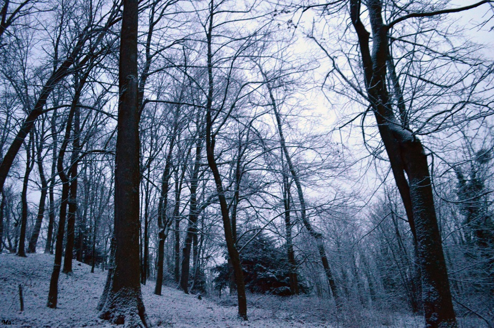 Je continue en direction de la colline de la Gontarde. Le sous bois est couvert d’un voile de neige. Les branches se sont parées de blanc. Personne encore n’est passé par là… J’aperçois deux chevreuils un peu plus loin, qui filent rapidement se mettre à couvert après avoir perçu le bruit de mes pas.