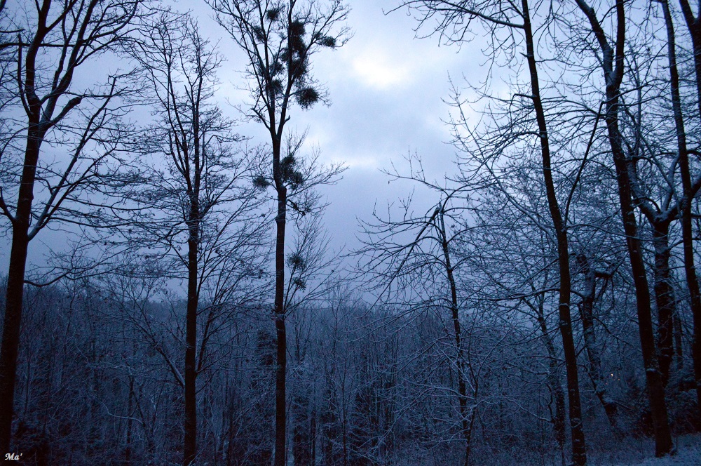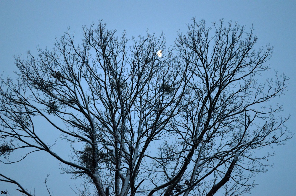 Mais le temps passe et il va être l’heure de travailler. Un dernier coup d’oeil aux cimes dénudées des arbres me fait apercevoir la lune.