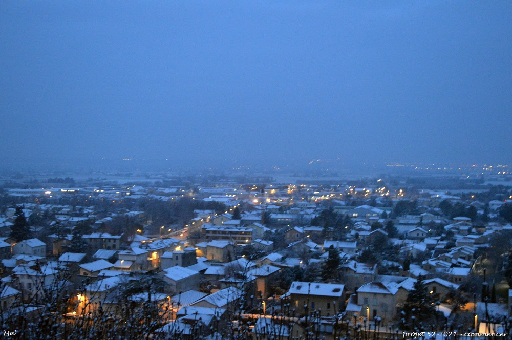 Voici donc comment j’ai commencé ma journée de mardi dernier, les pieds dans la neige, sur un belvédère dominant le village…. alors que le jour commençait !
