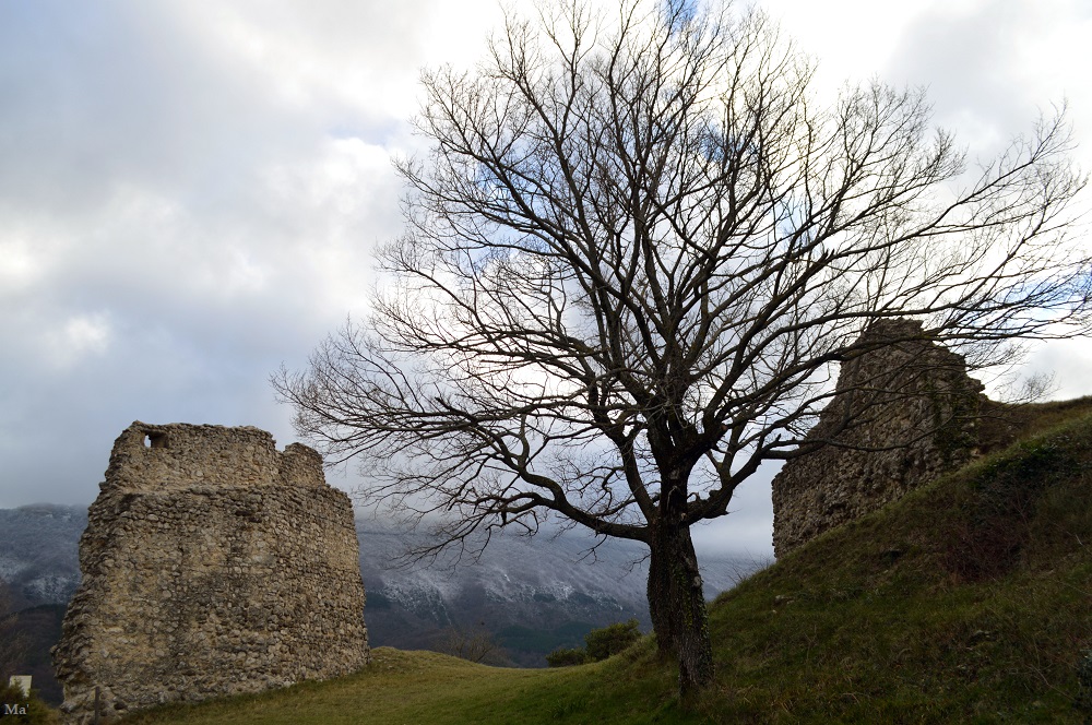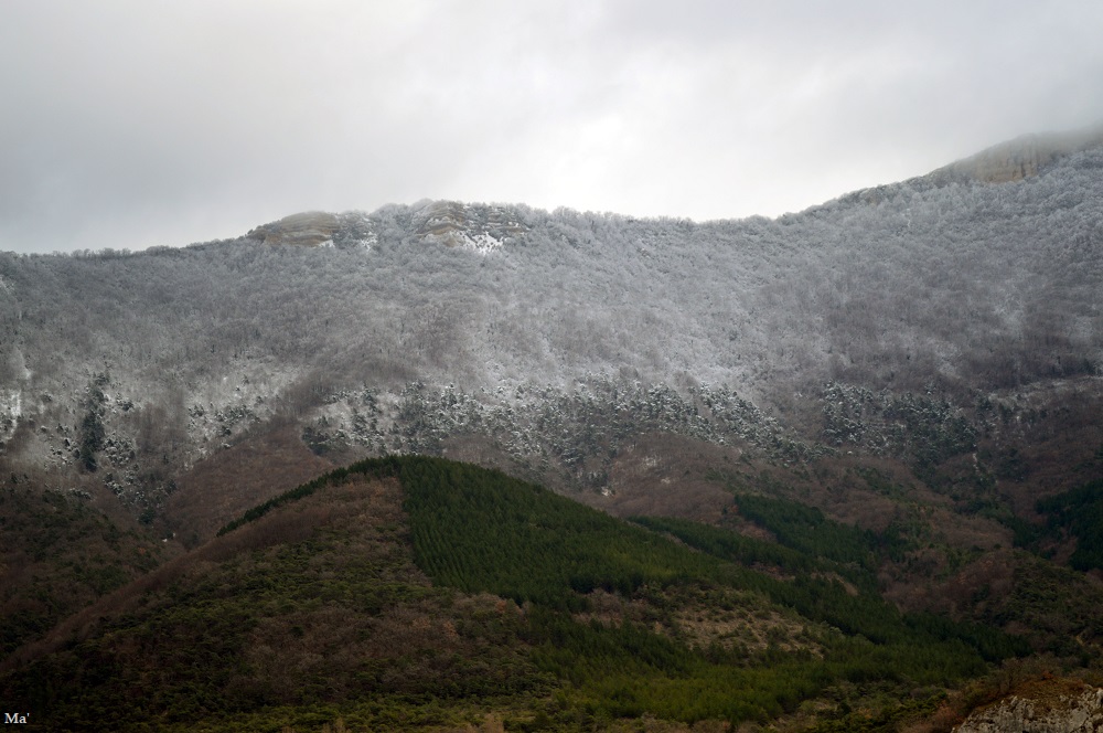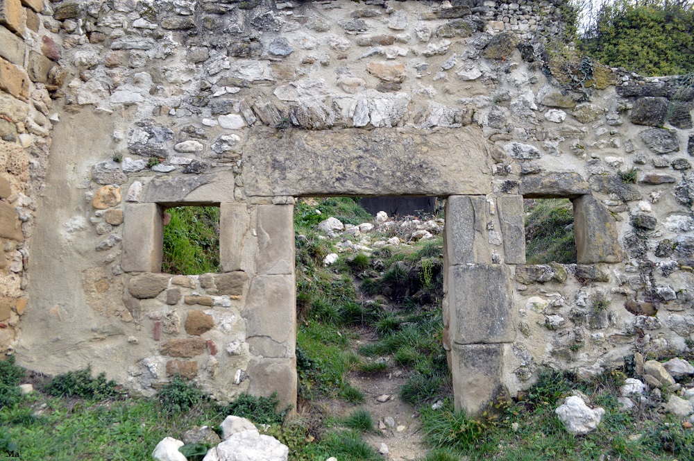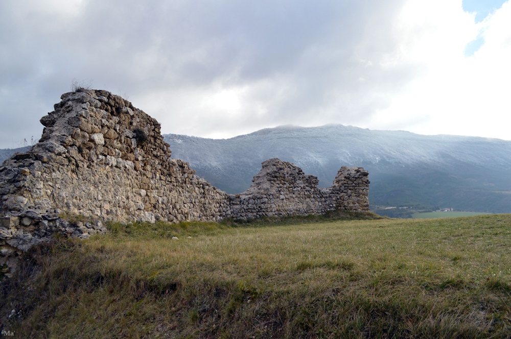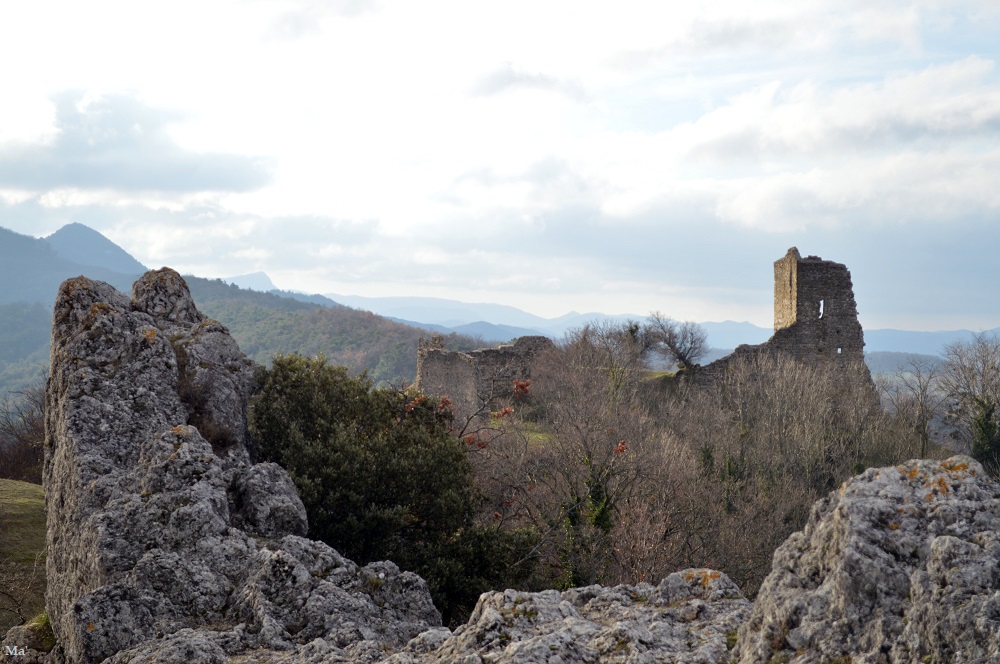 Du village, je pars en direction du site médiéval. Je traverse l’ancien village dominé par les ruines du château des Cornillans. Au delà, le sommet de la Raye a pris une teinte blanche avec les chutes de neige de la veille.