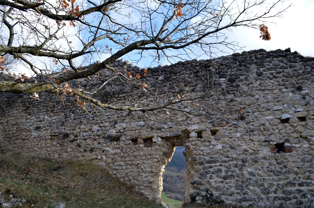 Mais cette fois, j’ai surtout envie d’explorer les ruines. Je retourne donc vers le château, et je m’aventure au pied d’un mur dont je n’avais jamais remarqué qu’il était accessible côté « intérieur ». Là, une ouverture permet d’admirer le paysage de la Raye. Je ne me lasse pas de la vue sur les sommets légèrement enneigés.
