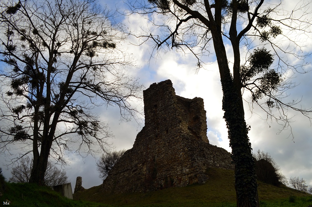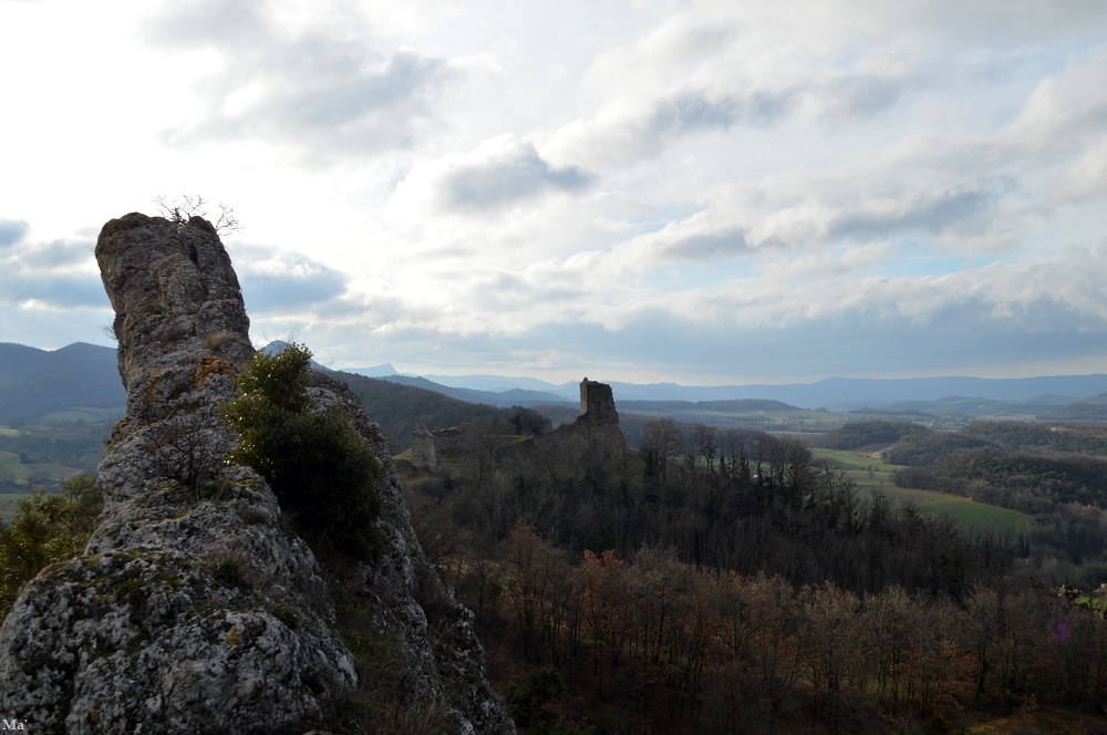 Malgré tout, la température est fraîche… Je vais donc me mettre à l’abri dans les ruines de l’ancien donjon. Ainsi, face à la vue sur la plaine, l’endroit est parfait pour sortir mon thermos de café et profiter d’une pause. Je m’amuse à retrouver les lieux connus dans le panorama qui s’offre à mes yeux….