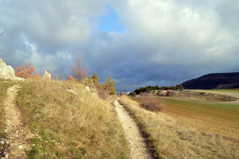 Il y a du vent, mais aussi un peu de ciel bleu. Après deux jours de pluies et juste après avoir fêté Noël, l’appel de l’extérieur est trop fort pour lui résister. Je pars donc pour La Baume Cornillane (ce n’est pas loin et s’il fait trop froid, la balade pourra facilement être écourtée).