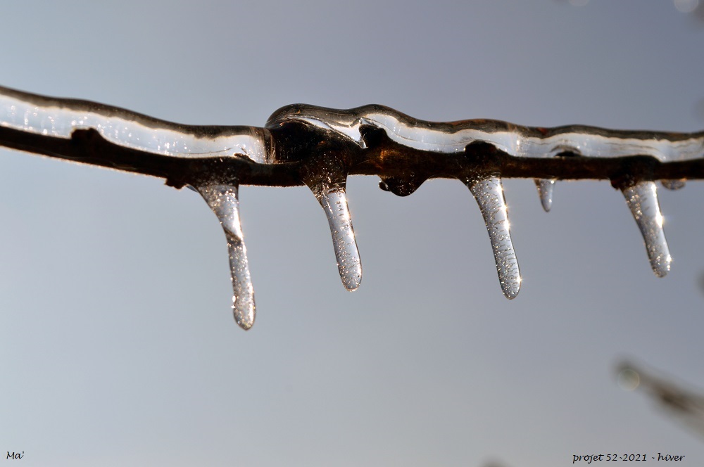 Mais finalement, la photo que j’ai choisie présente une branche d’arbre enserrée dans une gangue de glace. C’est une photo prise lors d’une courte balade improvisée dans un paysage digne du palais de La Reine des Neiges ! Soleil et glace jouaient ensemble pour rendre même une simple branche féérique…