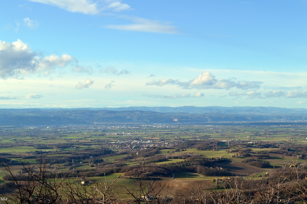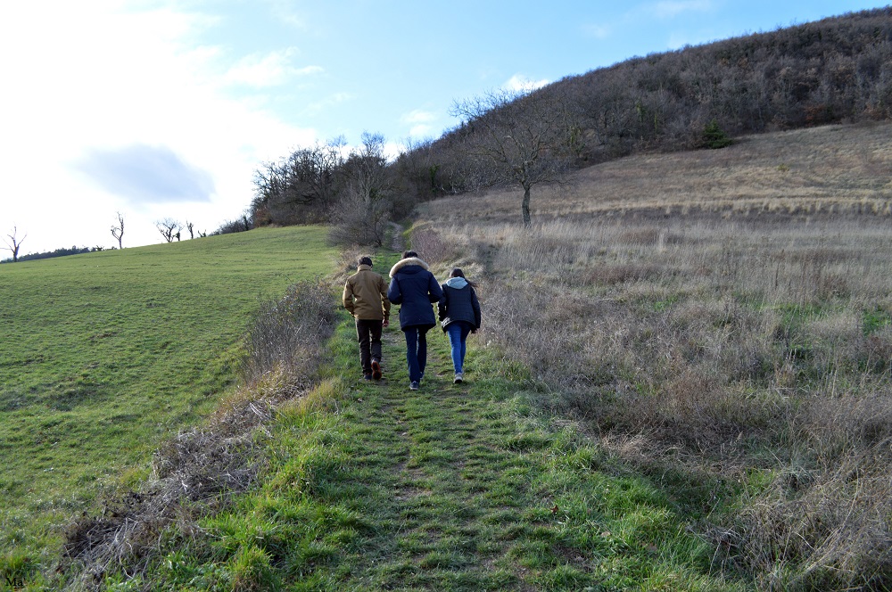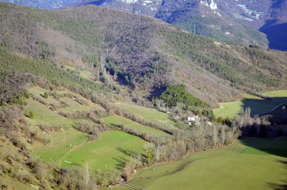 Au pied de la chapelle, nous avons pris le temps d’admirer le paysage de tous les côtés. Le ciel était clair et la vue bien dégagée, en particulier sur la plaine de Valence. Au loin, les sommets ardéchois se devinaient enneigés. De l’autre côté, le soleil éclairait encore les petites vallées, et nous avons regardé un troupeau de vaches (qui nous semblaient minuscules) se déplacer dans un champ.