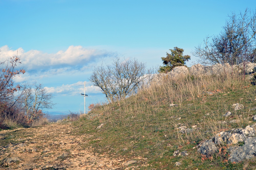 Après les pluies des jours précédents, la Véore était bien gonflée et si le passage à gué était possible sans se mouiller les pieds, cela ne devait pas être le cas quelques jours auparavant. A partir de là, nous avons suivi le chemin habituel : la montée le long des prés, les vues dégagées sur le Vercors derrière nous, le village qui s’éloigne peu à peu, puis la montée dans les bois à la végétation quasi méditerranéenne avant d’apercevoir la croix du sommet puis la petite chapelle blottie à ses pieds.
