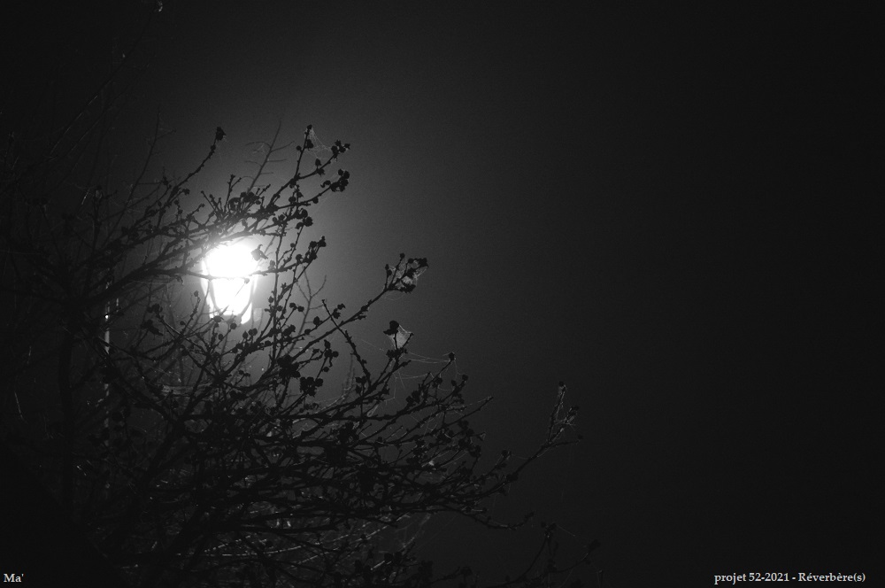 En effet, je l’ai prise un soir où je faisais des photos des décorations lumineuses pour Noël durant le mois de décembre. Juste avant, j’avais décidé de mettre ce thème sur la liste des thèmes pour 2021. Et, en rentrant après avoir photographié les lumières multicolores, j’ai aperçu ce lampadaire qui éclairait à travers les branches d’un arbre, soulignant quelques toiles d’araignée suspendues à celles-ci. Alors, j’ai pris une photo en sachant que je l’utiliserai pour ce thème et en sachant aussi que je la traiterais en noir-et-blanc.