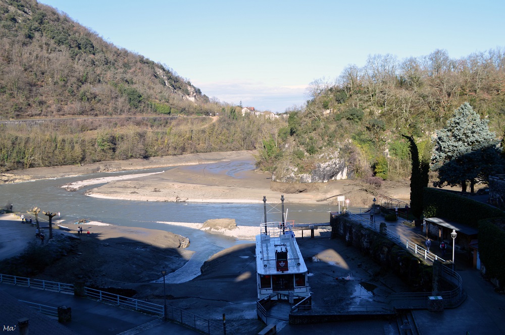 Le lac de la Bourne est ainsi essentiellement vidé en dehors du lit de la Bourne et de celui de la résurgence de Thaïs (qui compte-tenu des dernières pluies ont un bon débit). Le bateau à roues est posé à même la vase, fortement accumulée à cet endroit.