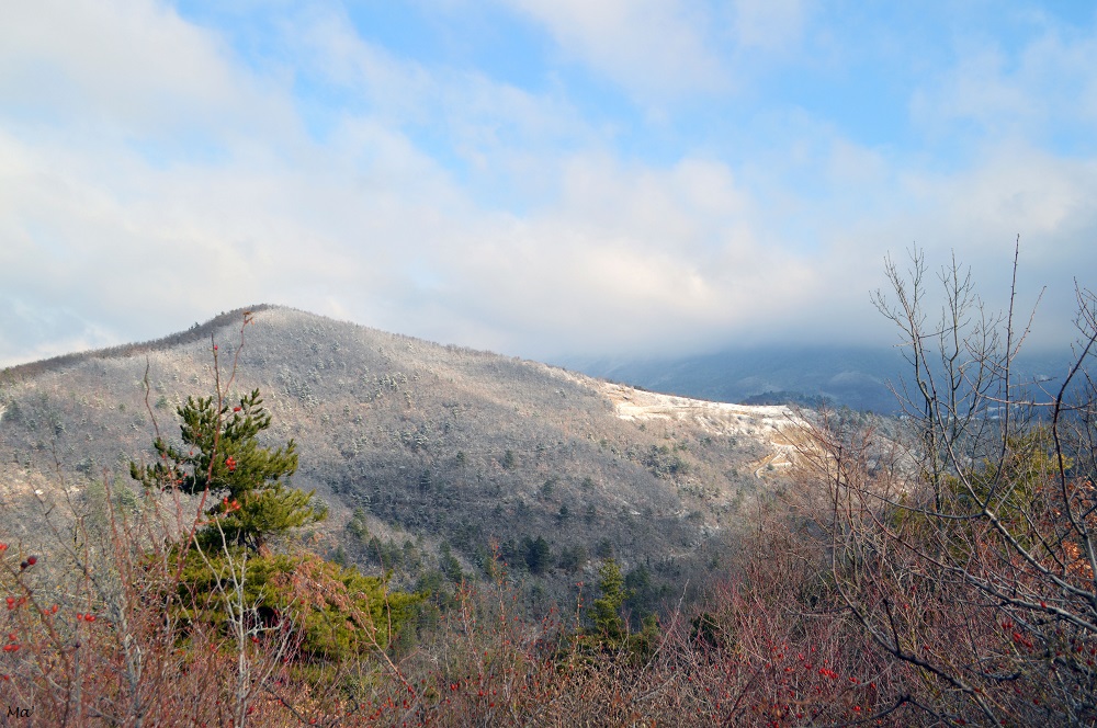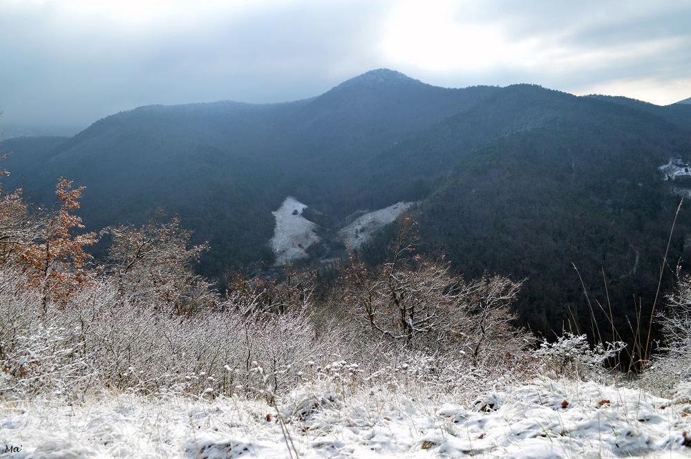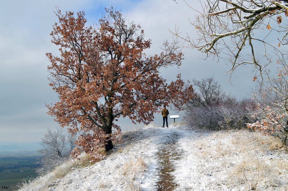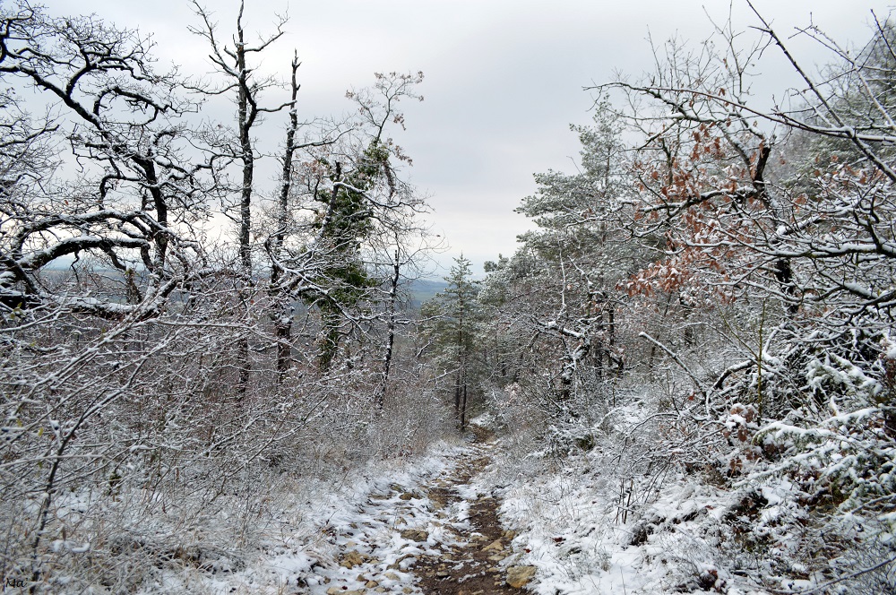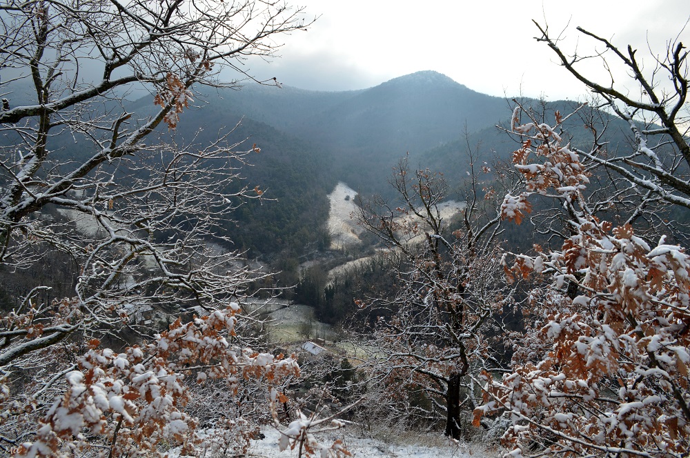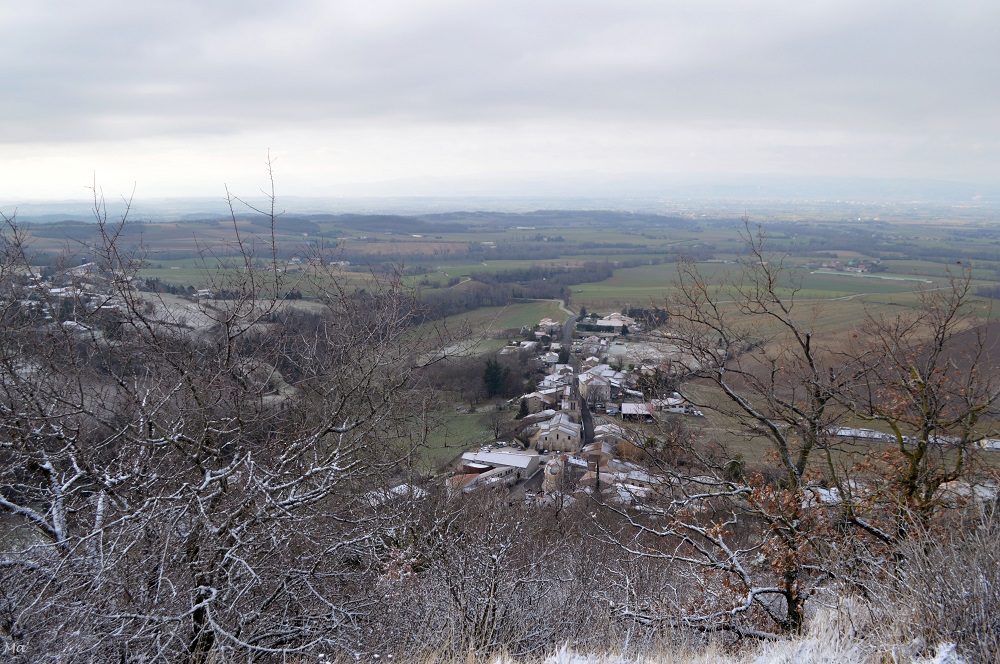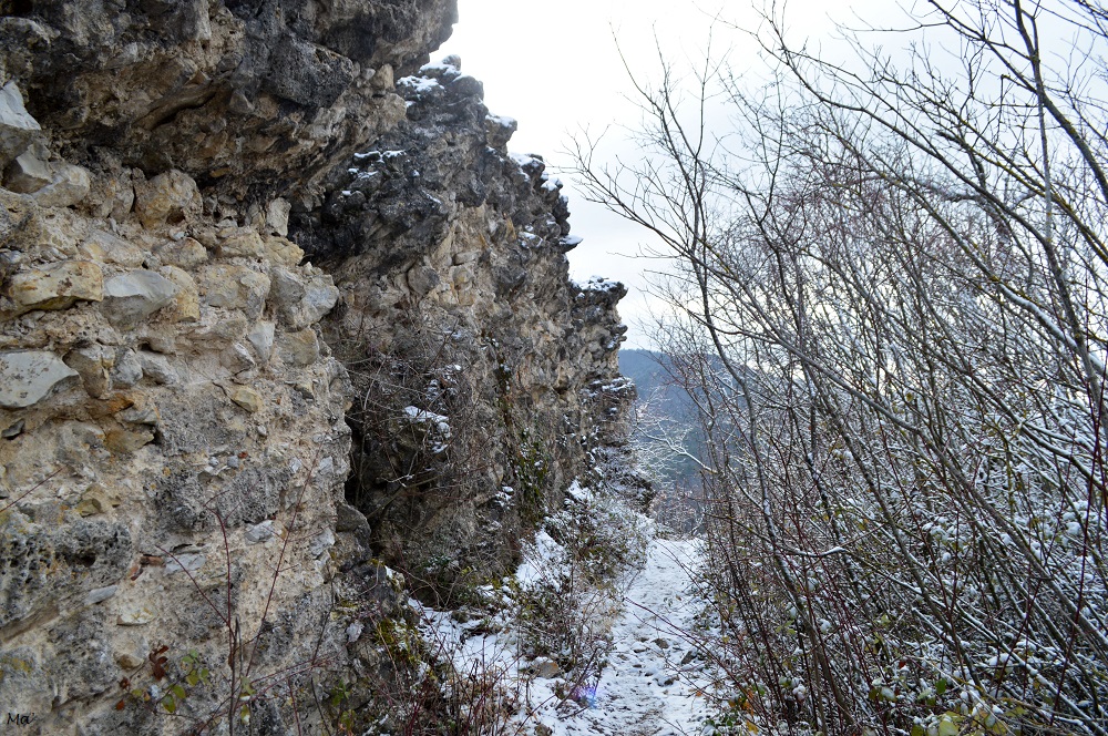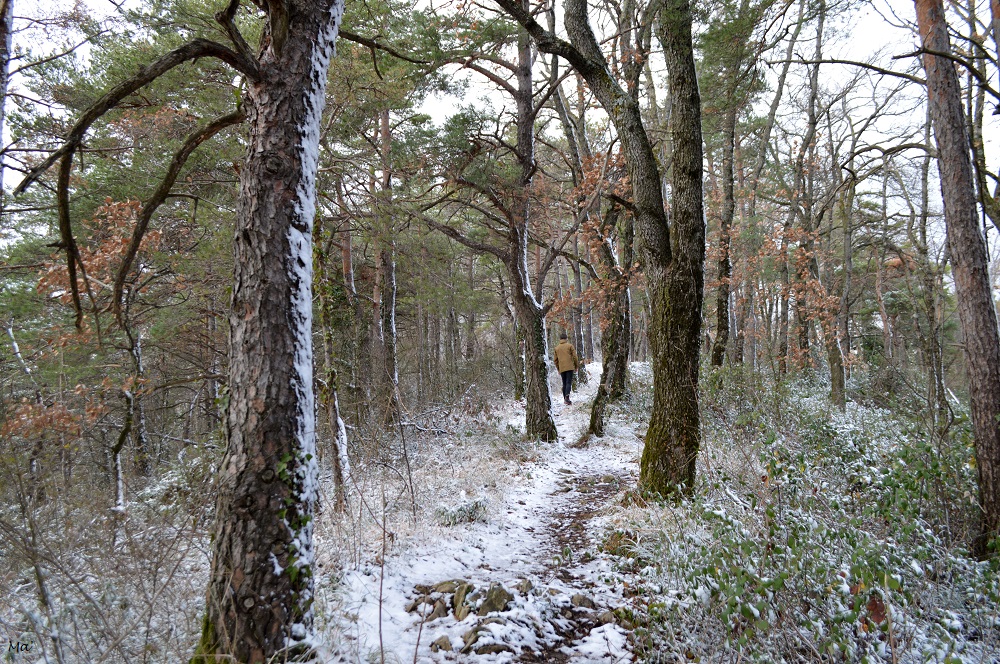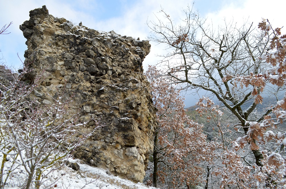 La montée jusqu’à Château Rompu commence au cœur du village, à deux pas de la fontaine. Très vite, le chemin s’élève entre les branches des petits chênes qui ont gardé quelques feuilles aux teintes automnales. La neige qui a blanchi le paysage apporte une petite touche de magie.