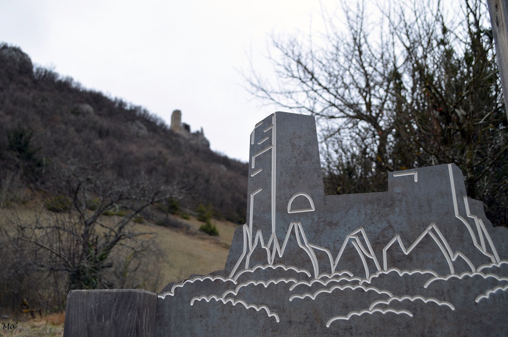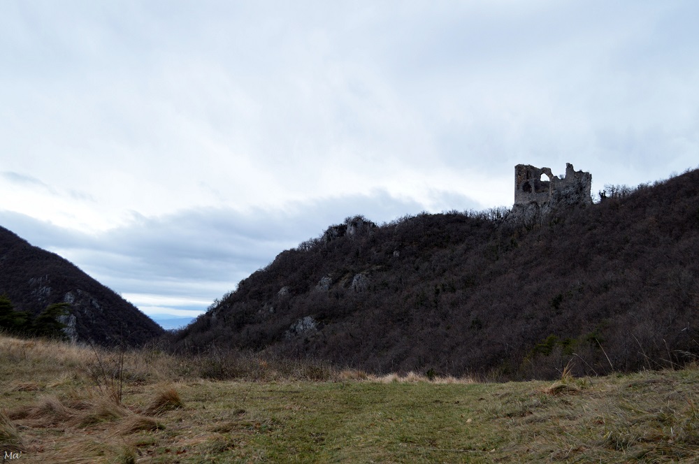 Finalement, progressivement, j’ai vu les ruines du château se rapprocher, et je suis arrivée au pied de l’ancien donjon. Compte tenu de la vue depuis cet endroit, il est aisé de comprendre le choix d’y installer une forteresse : le paysage permet de surveiller l’accès au col de Tourniol et au Vercors d’un côté, et toute la plaine de Valence et le débouché de la vallée de l’Isère de l’autre.