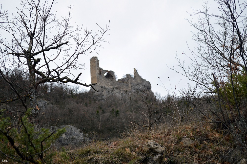 Revenant sur mes pas là depuis l’endroit où le chemin des Pellafols s’arrête, j’ai assez vite bifurqué en montée afin de rejoindre les ruines du château. J’avais vaguement regardé la carte avant de partir de chez moi mais j’ai suivi les chemins « à la direction » afin de contourner la combe qui me séparait de l’endroit où est bâti le château.