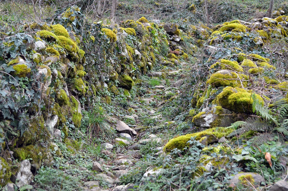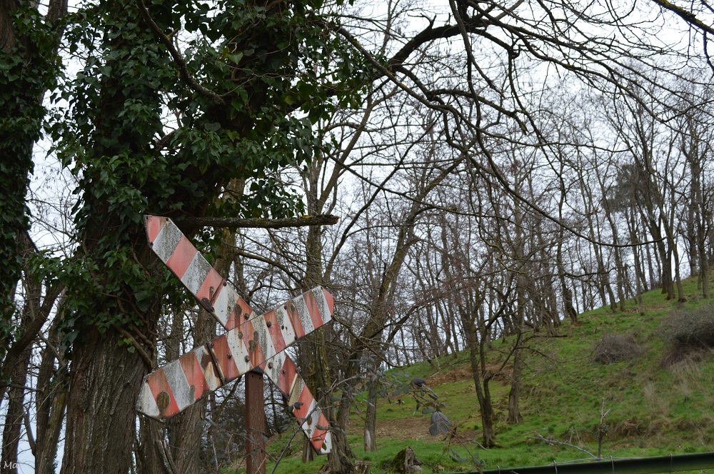 Nous n’avions rien décidé sur le trajet que nous ferions et nous nous sommes laissé guider par le temps (notre impératif était d’être assez tôt à la voiture pour pouvoir rentrer chez nous avant le couvre-feu sans avoir à nous inquiéter d’un éventuel ralentissement sur la route). La progression sur la Dolce Via est agréable : d’un côté la paroi arborée de la montagne, de l’autre la rivière. Nous croisons quelques (rares) maisons, quelques anciennes installations ou signalisations liées à la voie ferrée. Des ruisseaux ont creusé de petits ravins dans la montagne ; nous les entendons cascader vers la rivière. Finalement, nous arrivons plutôt rapidement à Saint Fortunat où nous décidons de faire demi-tour.