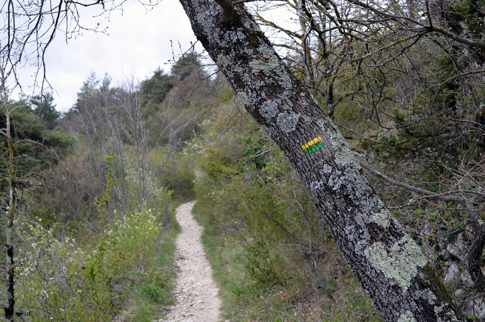 Mi-avril, j’ai repris la randonnée dans le Vercors (après l’entorse de la cheville que je m’étais faite en février). Je ne souhaitais donc pas m’aventurer sur des chemins que je ne connaissais pas , et j’étais également contrainte par la limitation des 10 km. Aussi, j’ai choisi d’aller dans le secteur de Combovin : l’idée de départ était de monter jusqu’à la chapelle Sainte Marguerite où je suis allée plusieurs fois cet hiver.
