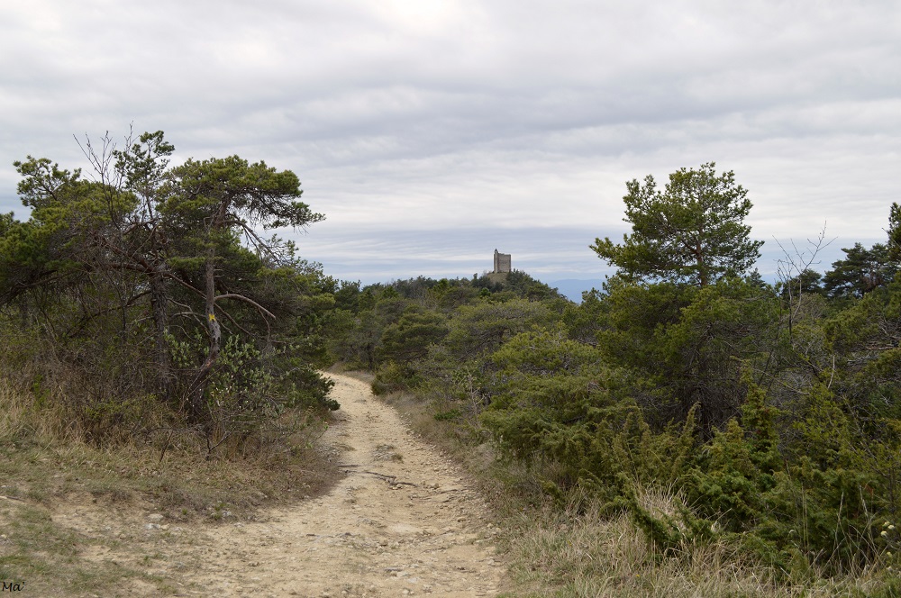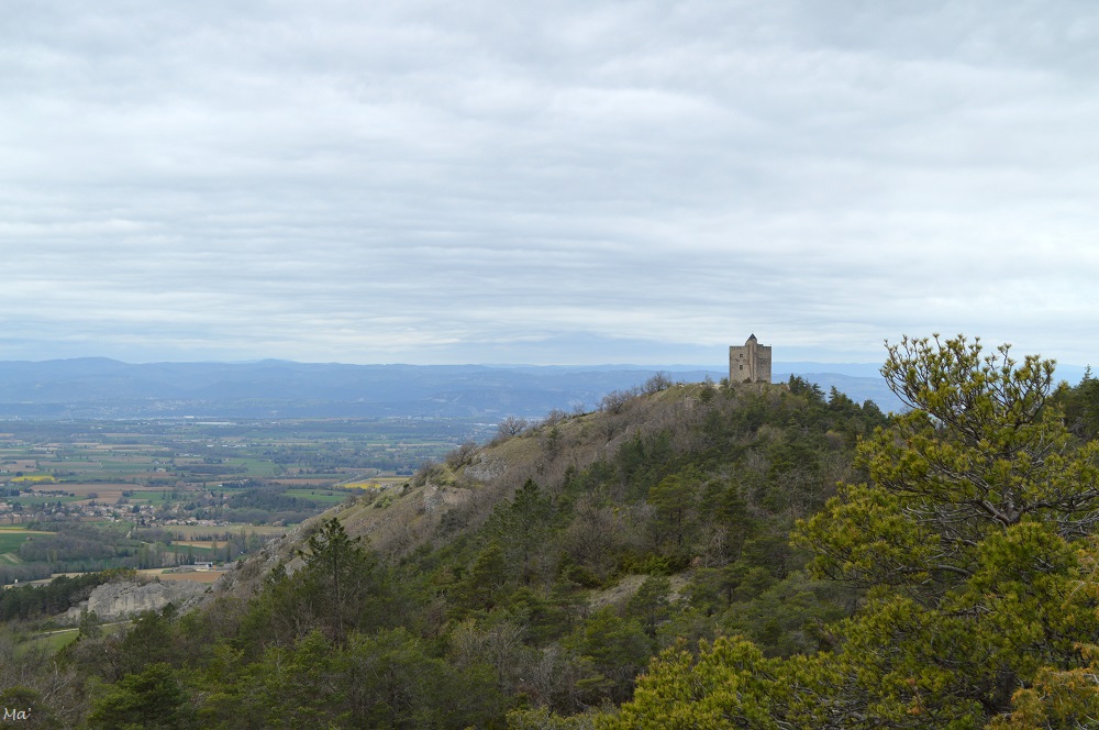Rapidement, la Tour de Barcelonne est devenue notre point de mire. Nous apercevions régulièrement sa silhouette dans les trouées de la forêt. Arrivés aux Terres Blanches, nous avons poursuivi sur la crête, histoire d’aller chercher quelques jolis points de vue supplémentaires. Au delà de la pinède, et de la Tour de Barcelonne, nous dominions la plaine de Valence, tandis que de l’autre côté, nous apercevions le hameau des Durons au fond du vallon de la Véore.
