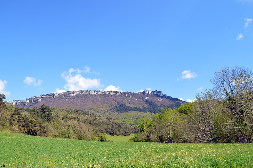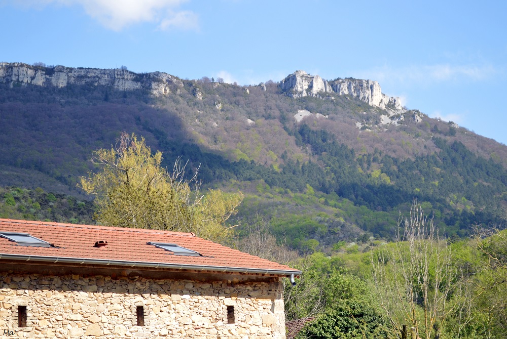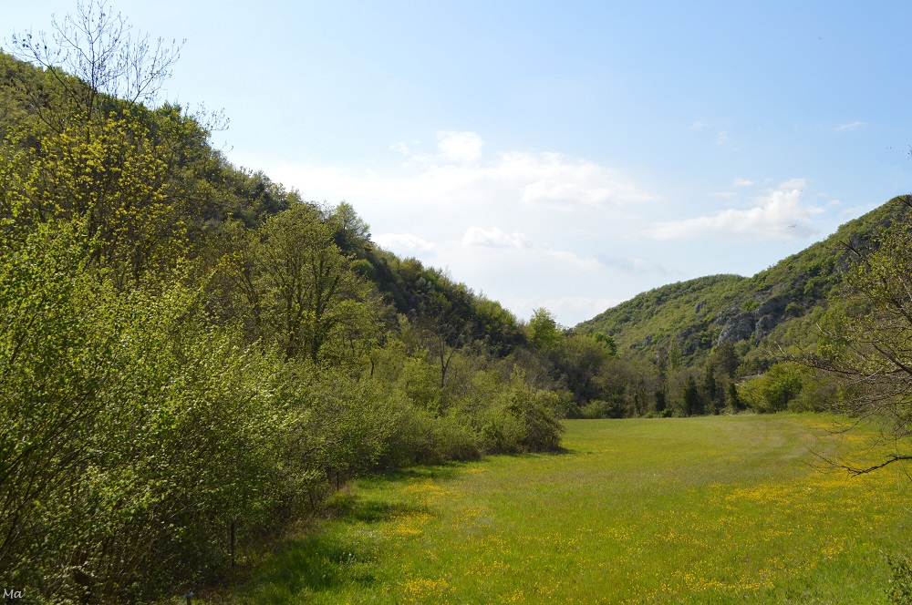 J’ai suivi la route qui longeait le ruisseau. Assez vite, la vue s’est dégagée et je me suis retrouvée avec les roches de Treillaras en point de mire. Au pied de la montagne, le printemps s’épanouissait en de multiples nuances de verts.