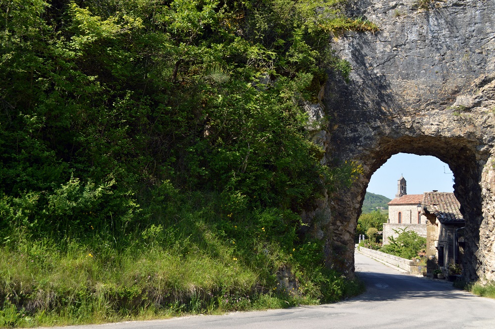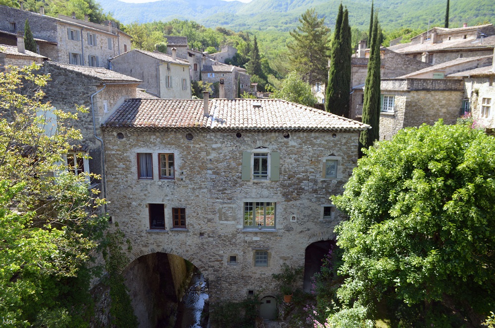 La vue sur le village depuis le pont principal mérite de prendre le temps de s’y attarder. Les maisons semblent accrochées aux flancs du ravin de la Malle, serrées les unes contre les autres, avec au premier plan les habitations situées sur le vieux pont.