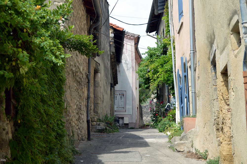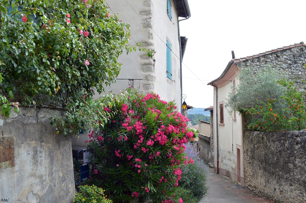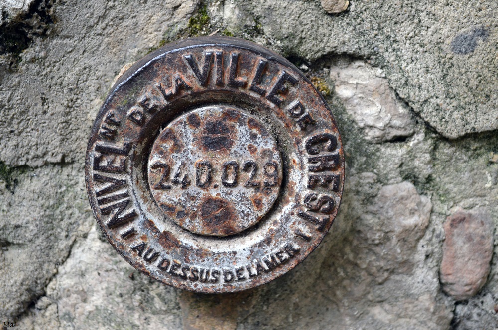 Nous avons croisé des maisons aux façades récemment refaites arborant des couleurs vives, évoquant la douceur de vivre du Sud. Nous avons fait la connaissance d’un chat venu à notre rencontre depuis l’avancée de toit sur laquelle il faisait la sieste. Nous avons admiré de jolies portes anciennes donnant dans des ruelles fleuries. Et j’ai aussi trouvé par hasard une borne de nivellement, indiquant que Crest se situe à un peu plus de 240 mètres au dessus du niveau de la mer.