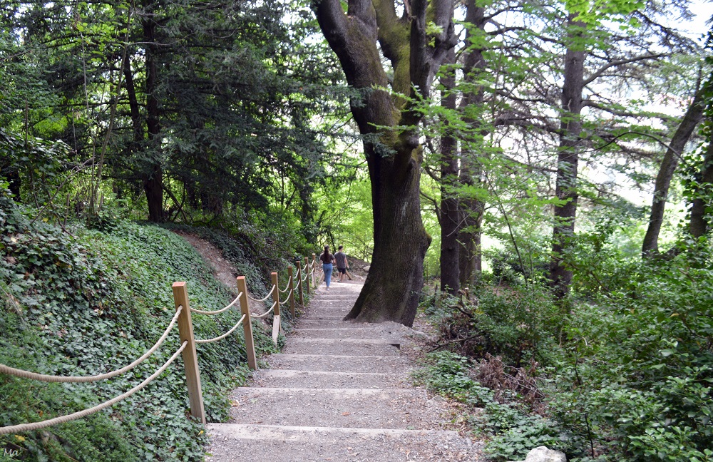 Cette fois, nous sommes partis du pied de la Tour. De là, le chemin des remparts a été réaménagé et conduit via des escaliers à travers les bois jusqu’à une petite porte percée dans les anciens remparts de la ville. De là, on a une jolie vue sur la ville moderne avec les Trois Becs en toile de fond.
