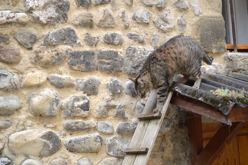 Vu qu’il a sa petite rampe d’accès, je pense que c’est le chat de la maison, et il ne semblait pas malheureux en effet… Pas avare de câlins non plus d’ailleurs !
