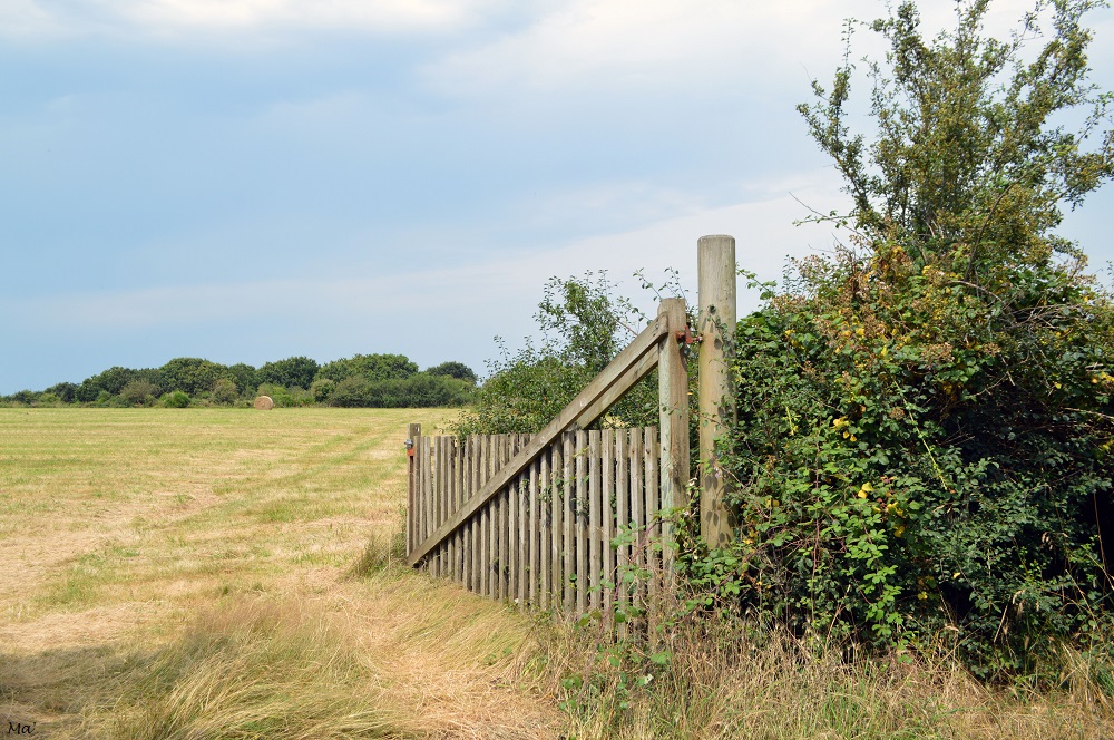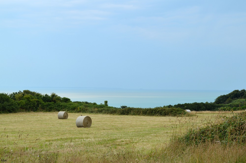 De là, un sentier se faufile dans le bocage pour rejoindre le GR223 qui longe les côtes de la Manche (le département…. car si le sentier se prolonge sur les côtes de la Manche, la mer, il change de numérotation à son arrivée en Bretagne). Les foins ont été coupés peu de temps avant et les ballots apportent du relief dans les champs bordant la mer.