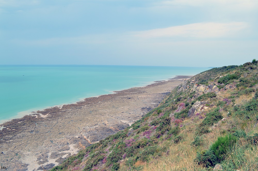 Autour de nous, c’est un paysage de lande qui se déploie sur les falaises avec de nombreuses bruyères en fleurs. En contrebas, la mer basse prend des teintes magiques sous le soleil, et donne au lieu un air de paradis.