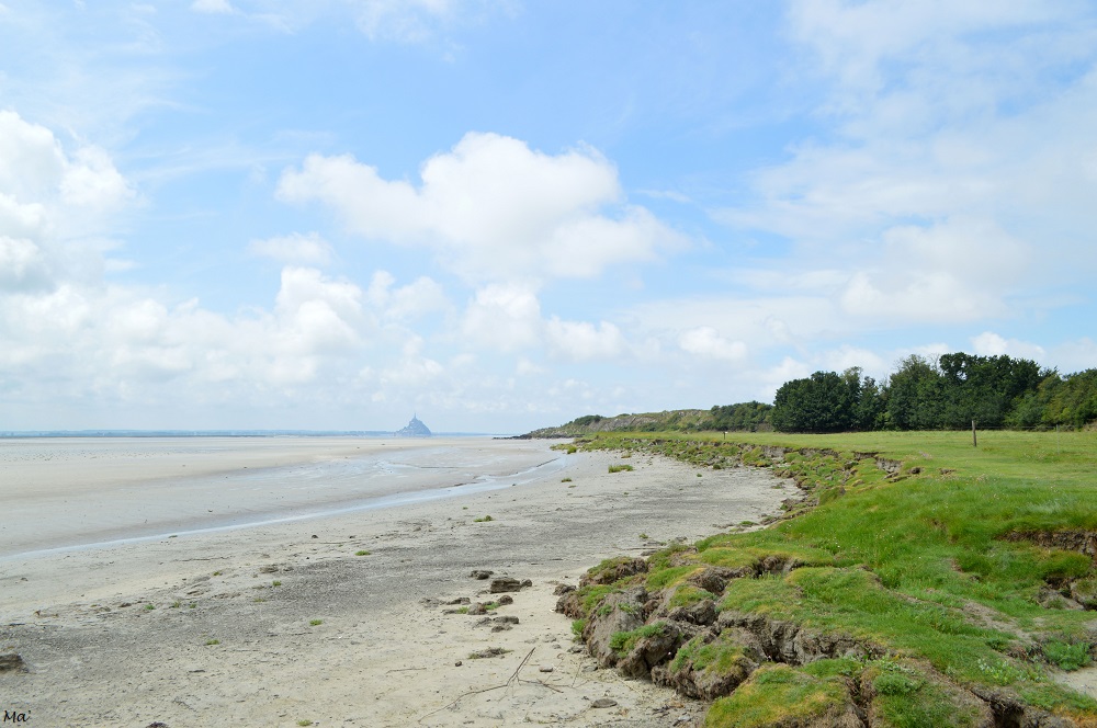 La chapelle Sainte Anne de la Grève est située sur la digue, pour protéger des inondations dues aux marées les polders situés au delà.A la limite de l’herbu et de la plage, le Mont Saint Michel à l’horizonSeuls sur la plage….Marcher sur l’estranLe charme de la chapelle Sainte Anne de la GrèveContourner la lagune