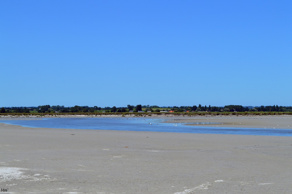Continuant en direction du bord du fleuve, nous sommes rapidement arrivés sur la tangue, ce sable si particulier de la baie. Par endroits, avec le soleil, le sol a séché et s’est transformé littéralement en bancs de sable qui nous font penser à une plage lointaine.