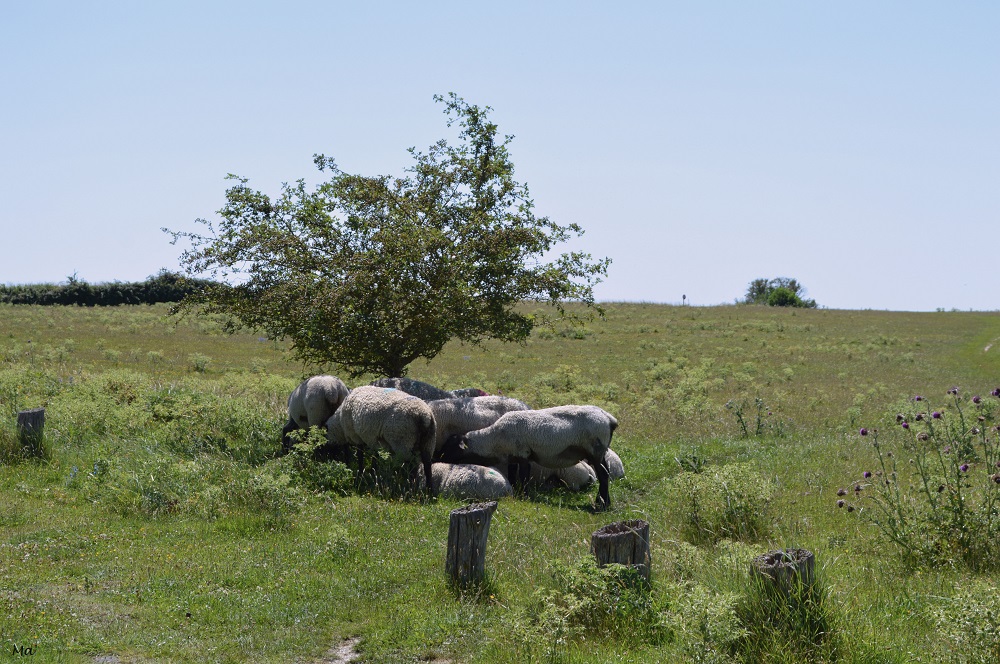 Après avoir laissé la voiture dans un renfoncement en bordure de route, nous avons longé les champs pour accéder à l’herbu. Là, nous avons très vite aperçu les moutons qui peinaient à trouver un peu d’ombre sur le tertre rocheux.