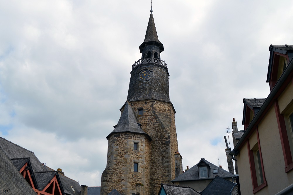 La tour a été édifiée à la fin du XVe siècle par les bourgeois de Dinan. Elle est alors destinée à servir de salle de réunion et de point de surveillance des départs d’incendies. Au tout début du XVIe siècle toutefois, la Duchesse Anne autorise Dinan à installer une horloge dans sa tour. La ville devient ainsi la 3e ville de Bretagne à posséder un beffroi, après Rennes et Fougères. Le mécanisme est toujours visible dans la tour. En montant l’escalier à vis de la tourelle, on accède à deux salles qui permettaient à la municipalité de se rassembler. C’est ensuite un escalier en bois (partiellement en échelle de meunier) qui conduit dans le faitage de la tour, et permet l’accès à la plateforme située autour des cloches (qui sonnent tous les quarts d’heure…bien que prévenus, nous avons été surpris par le tintement bruyant !). Là, à plus de 30 mètres de haut, nous découvrons le panorama à 360°. La ville s’étale à nos pieds, et la vallée de la Rance prolonge l’ensemble. Nous jouons à retrouver les endroits où nous sommes passés plus tôt dans la journée. L’endroit n’étant pas bien grand, nous laissons la place aux visiteurs suivants après en avoir bien profité et redescendons au niveau du sol.