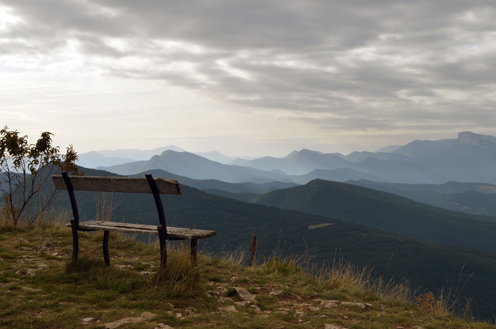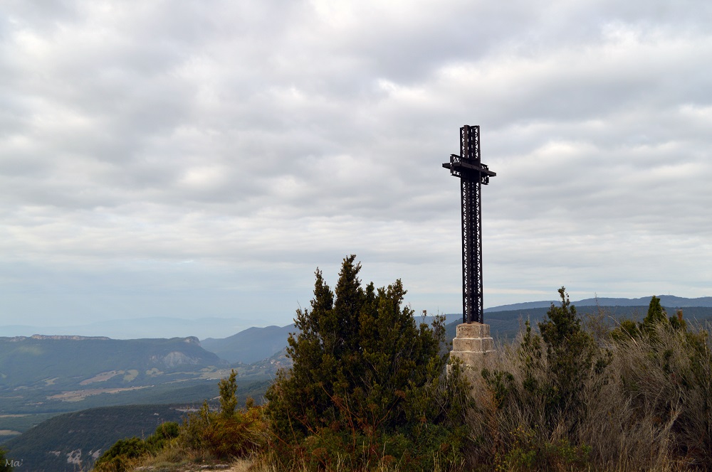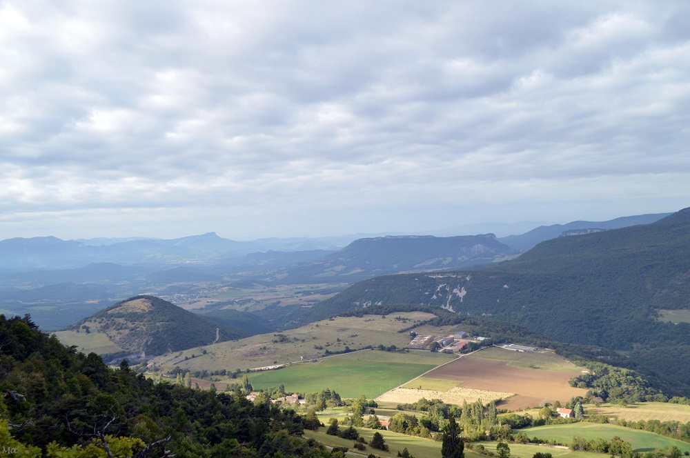 Je me suis approchée du bord du plateau. Le paysage se déployait, grandiose, à mes pieds. De là, la vue embrasse le synclinal de Saoû, les gorges d’Omblèze et le plateau d’Ambel, le Diois, et porte même jusqu’au Dévoluy. Le banc au pied de la croix invite à la contemplation. Alors, je me suis assise. J’ai sorti ma thermos de café. Et tout en me réchauffant du vent glacé, j’ai admiré les silhouettes des montagnes.