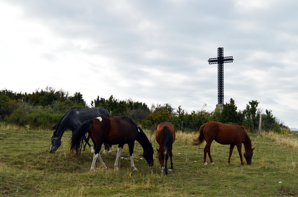 Alors que j’avançais sur le plateau, ce sont des chevaux qui paissaient l’herbe rase entre les pierriers, vestiges de la période glaciaire. La croix se détachait sur le gris du ciel, s’y fondant par moments dans un camaïeu de gris.