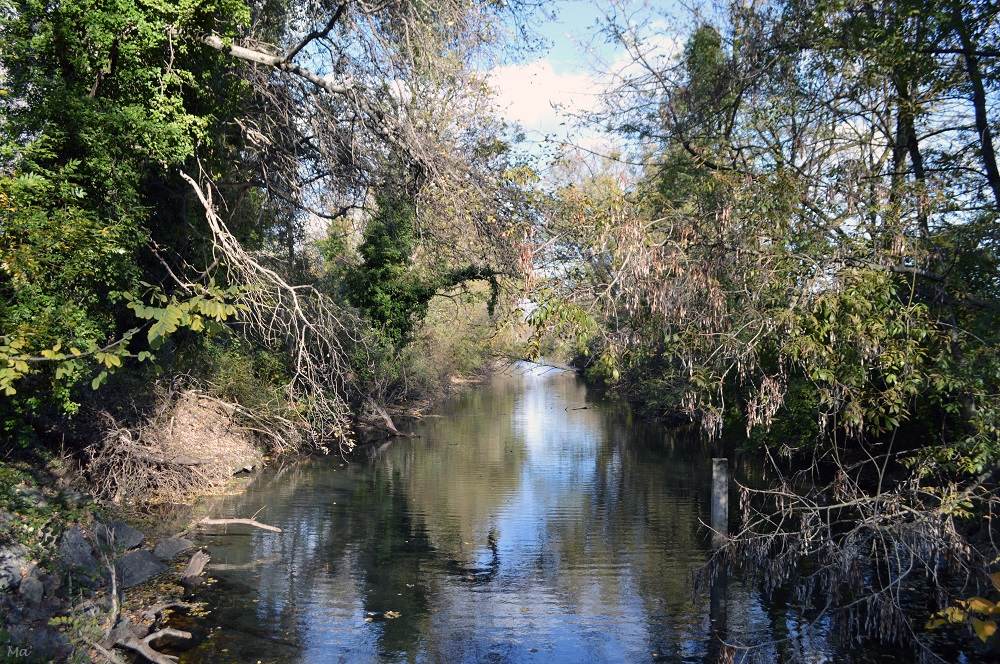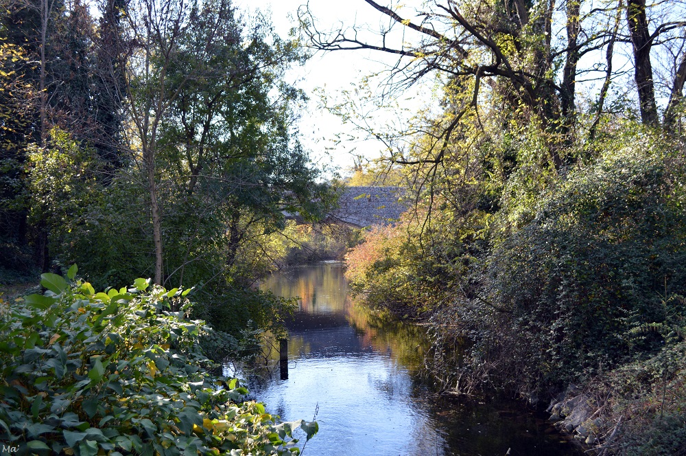 Afin de profiter du beau temps, j’ai choisi de ne pas aller jusqu’aux arches peintes du pont en voiture mais de marcher un peu pour y arriver. La sortie a donc commencé comme une balade bucolique, le long d’une petite route. L’automne déploie ses couleurs et sa lumière sur les lônes, ces petits bras du Rhône en marge du lit principal du fleuve.