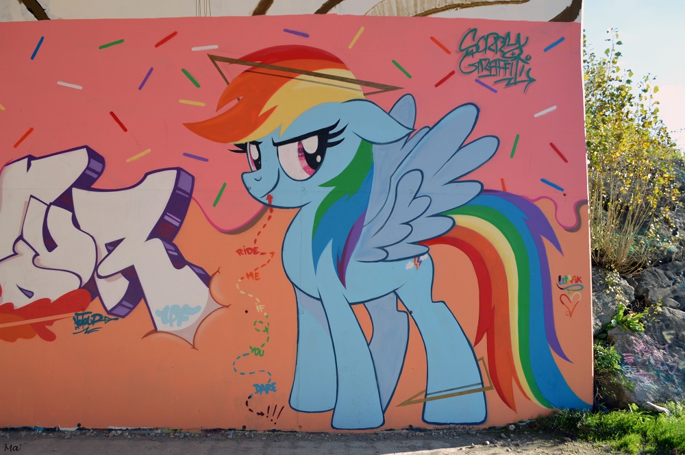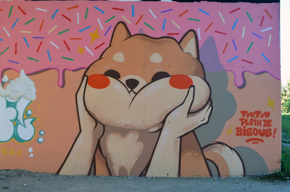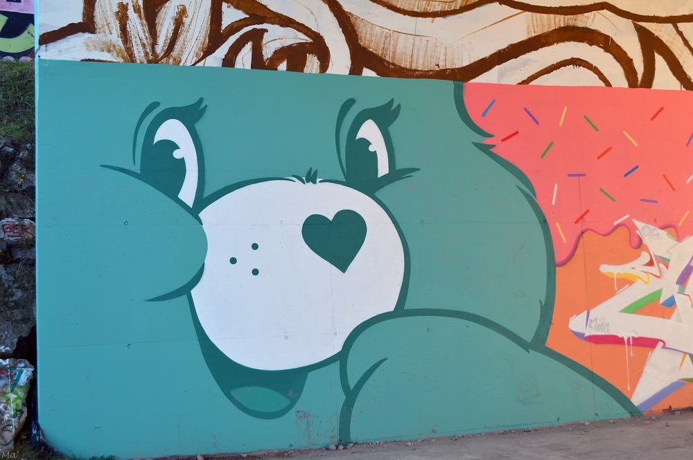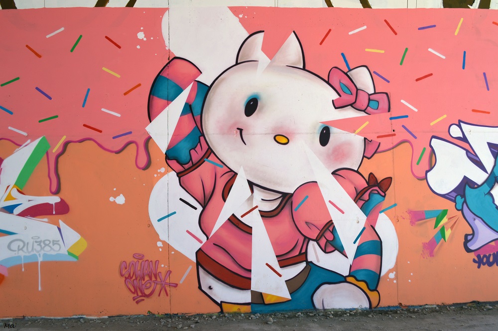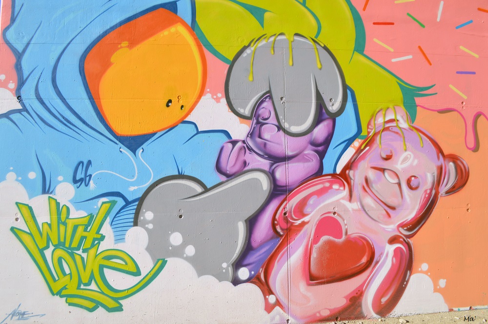 Il faut ainsi revenir de temps à autre car les fresques changent régulièrement, recouvertes par d’autres œuvres, toujours aussi monumentales. Les nombreux hommages au graffeur Ivory, décédé accidentellement en juin 2019, laissent peu à peu la place à d’autres œuvres. Sweety graffitis, la dernière fresque du collectif valentinois Sorry Graffiti, tout en rose bonbon et autres couleurs acidulées, a ainsi le goût de l’enfance douce et heureuse : Bisounours, My Little Poney, Gummi Bears, Hello Kitty et autres petits animaux kawai s’étalent ainsi que les murs….