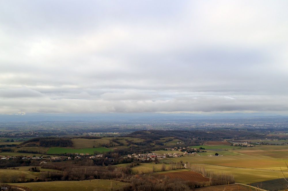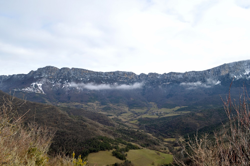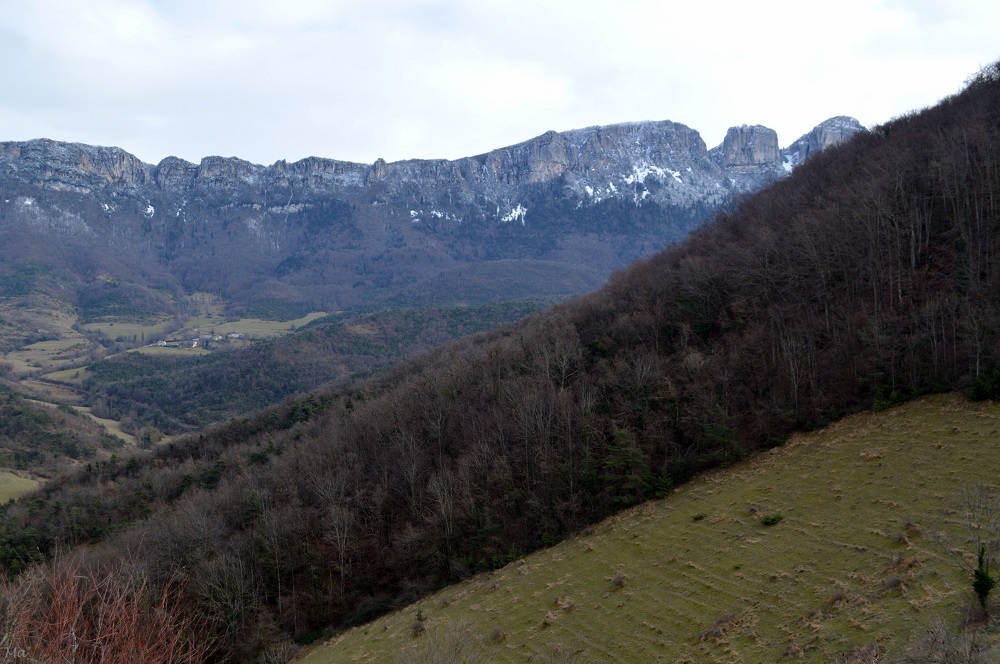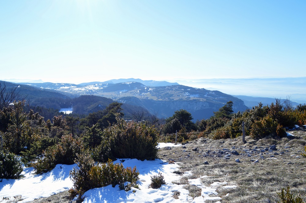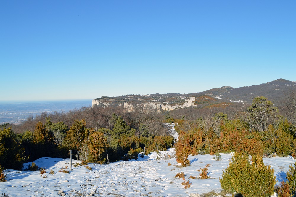 Une fois en haut, le panorama est grandiose avec d’un côté la plaine de Valence (hélas un peu cachée par la pollution ce jour-là) bordée par les falaises du Vercors et de l’autre les sommets du Vercors et les flancs du plateau de Font d’Urle. La présence de la neige ajoute un peu de magie supplémentaire au tableau.
