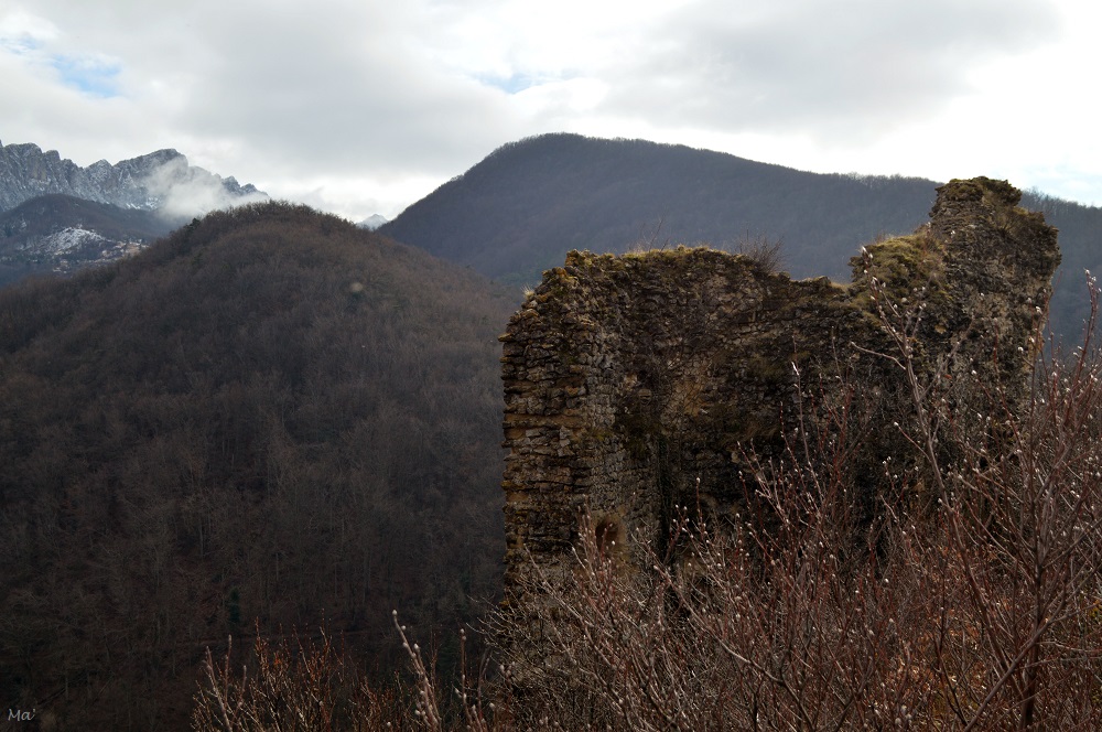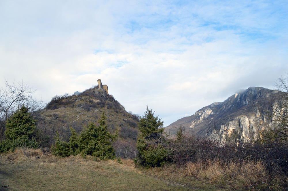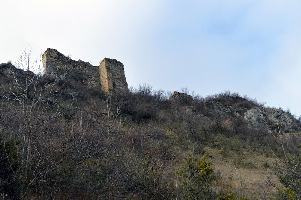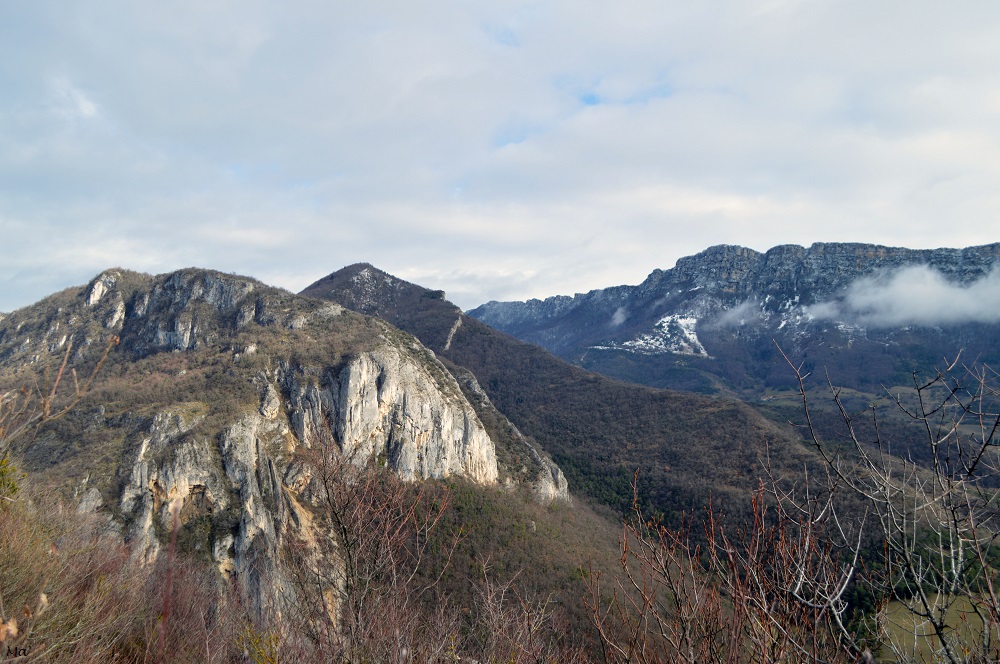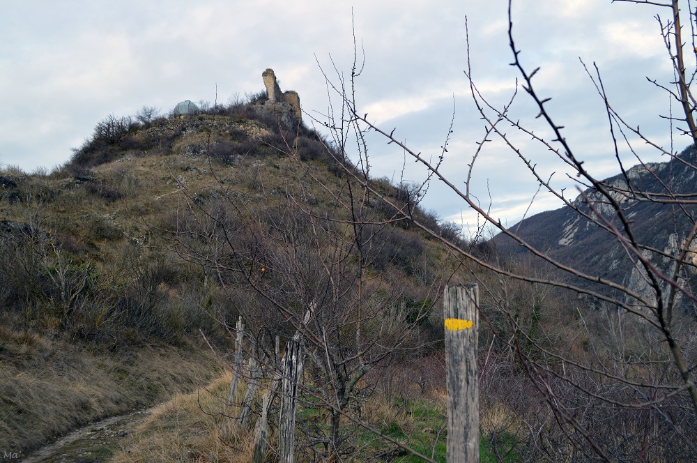 Vue sur la plaine de ValenceDans la montée vers le château depuis les DucsOn aperçoit l’observatoire astronomique sur la gaucheLes montagnes de Musan et de l’Epenet sont légèrement enneigéesVue le vallon Saint Genis (qui a la réputation d’être un excellent spot à orchidées au printemps)Dans les ruines du châteauEntre les montagnes, les gorges de la Combe d’OyansSur le chemin du col Saint Genis depuis le châteauUn coup d’oeil à la « Momie » du VercorsUn dernier regard au château
