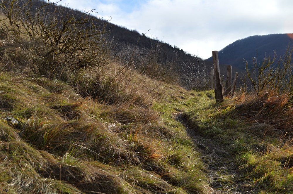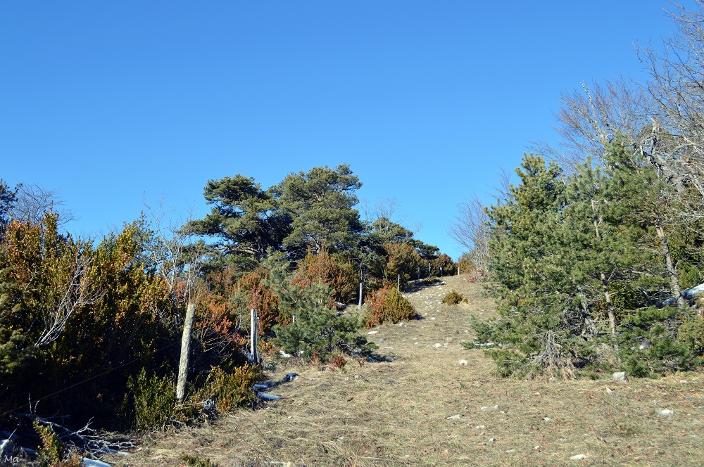 Au bout de ce pré, toujours sur la droite, on devine un sentier qui monte à flanc de colline. C’est par là qu’il faut passer. La pente est raide (et c’est ce qui m’avait fait rebrousser chemin la fois précédente). Mais à l’approche du sommet, on voit se profiler la croix.